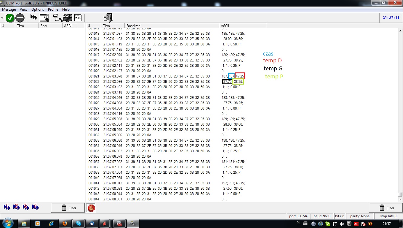 Postanowiłem sprawdzić czy mój sterownik wypluwa dane na port. Jak się okazało sterownik działa jak najbardziej poprawnie. Sprawdziłem to programem COM port toolkit 3.9. Sterownik wypluwa wszystkie dane o temperaturach i czasie trwania profilu.Poniżej screen z programu.