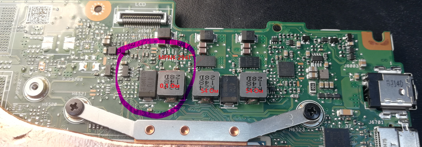 Zauważyłem zwarcie na linii B+. Po odlutowaniu PJP8701, PJP8300 oraz podniesieniu cewek zasilania CPU i GPU w powietrze (widać pod kamerą IR), nagrzewa się tranzystor drMOS MPNK 2941.