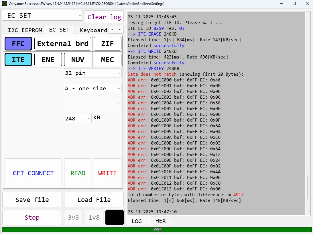 SVOD4 odczytuje jakieś głupoty. Połączyłem się przez Vertyanov Successor odczytuje sensownie wsad z układu, można nawet zobaczyć model laptopa ze wsadu na układzie, który nie pokrywa się z moim modelem tylko oprogramowaniu Vertyanov Successor nie mogę znaleźć kasowania układu. Zgrałem i zastąpiłem wszystko FF ale przy wgrywaniu pokazuje błąd i tak kawałek wsadu nie nadpisuje. Zastanawiam się czy nie ma jakiejś blokady.