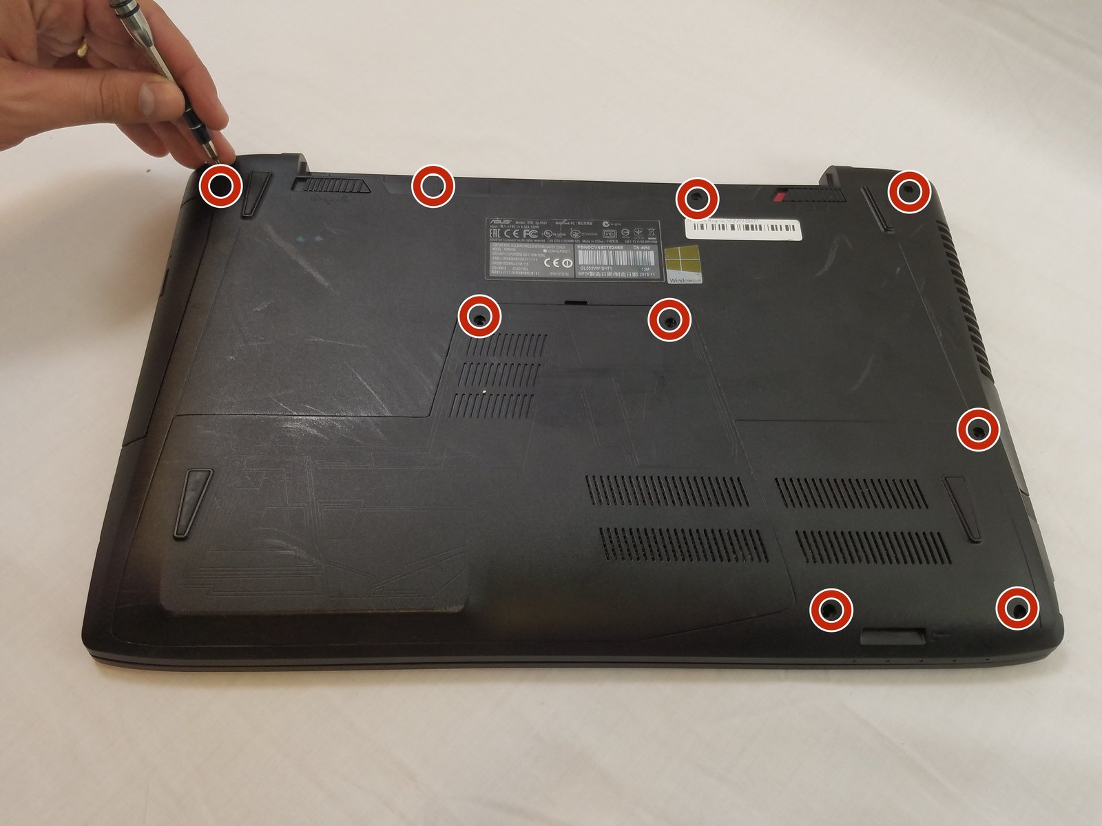 Rayu85 napisał(a):niestety nie mogę znaleźć instrukcji serwisowej do tego laptopaI na chwilę obecną nie znajdziesz. Odseparowanie palmrestu z klawiaturą od dolnej obudowy wymaga odłączenia baterii, odkręcenia 9 śrub od spodu laptopa, zdemontowaniu pokrywy dysku i wymontowaniu dysku, a dalej palmrest trzyma tylko na zatrzaski - do tego nie jest potrzebna instrukcja (zdjęcia umiejscowienia śrub poniżej - zapożyczone ze strony iFixit.com). Natomiast weź pod uwagę, że sama klawiatura w tym modelu jest zgrzewana do palmrestu i jej wymiana nie ograniczy się do odkręcenia kilku śrubek.