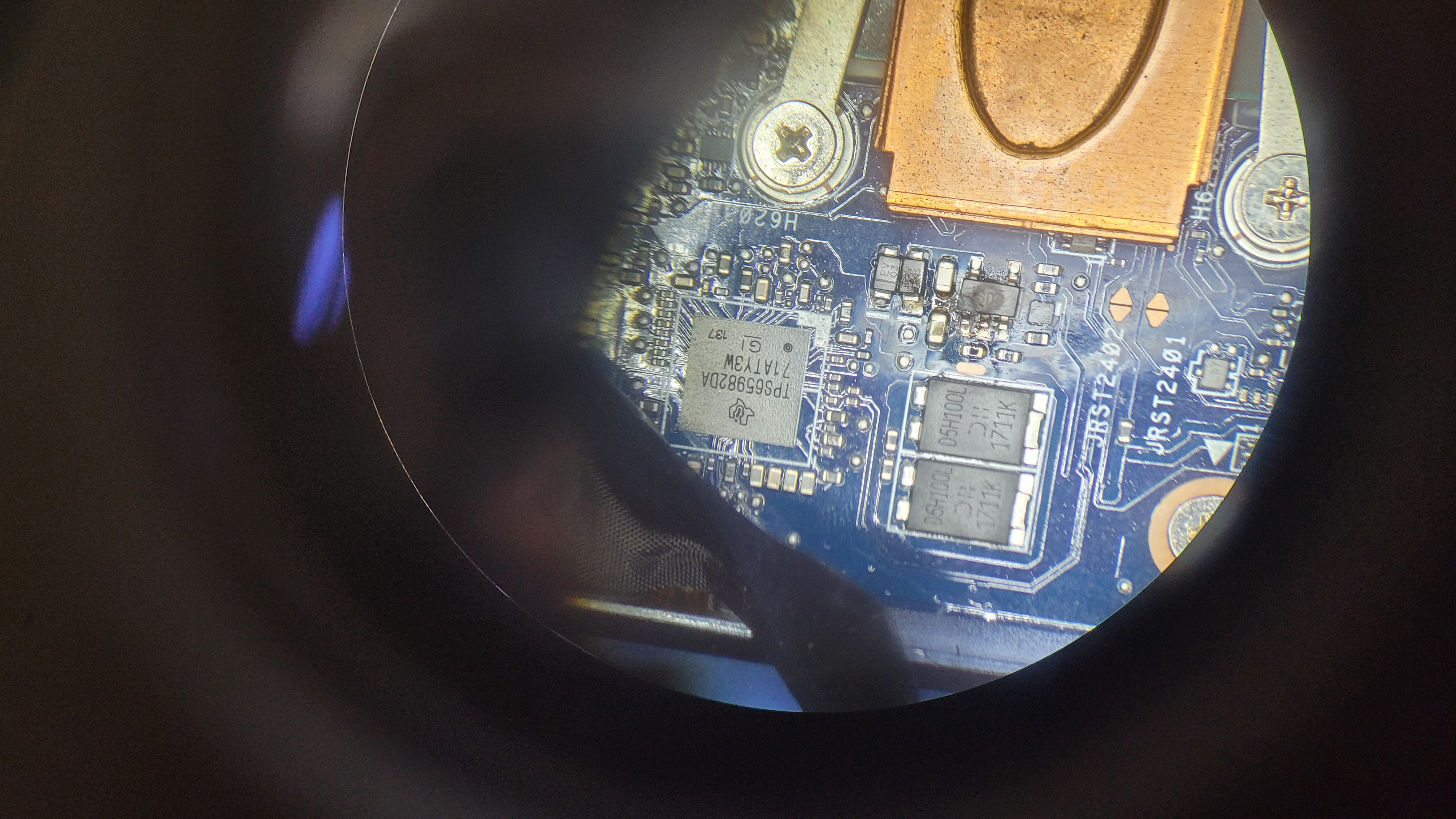 Dodatkowo zapytam po pierwsze czy coś jeszcze tu warto sprawdzić? Laptop normalnie się uruchamia ale nie ładuje baterii. Zauważyłem na tym układzie BGA (tps65982da) tuż obok spalenia że są takie ciemniejsze kondensatory - zaznaczyłem na czerwono. Jest na nich zwarcie do masy - to jest normalne?