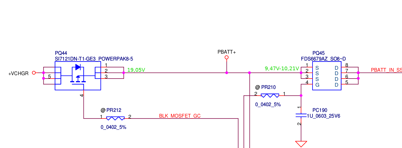 Faktycznie po wylutowaniu PU1300 zwarcie ustąpiło, wymieniłem na ISL88731C bo miałem taki na innej płycie, rezystancja w tym miejscu w tej chwili wynosi 10k Ω. Jedna nic to nie zmieniło i nadal bateria nie jest ładowana.
