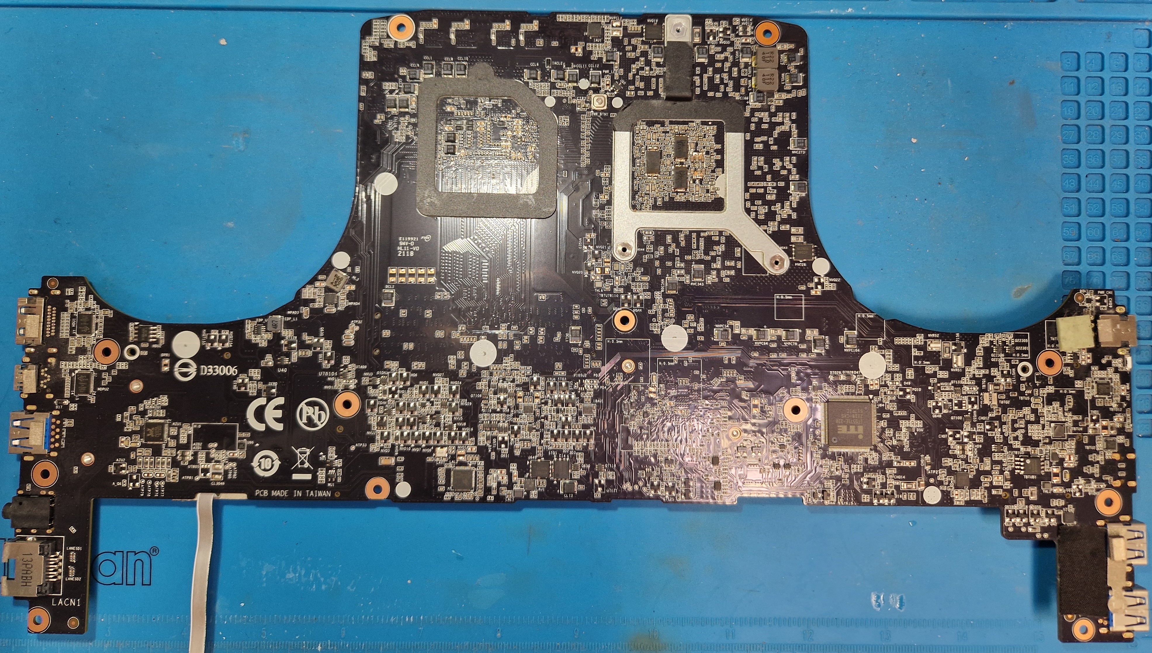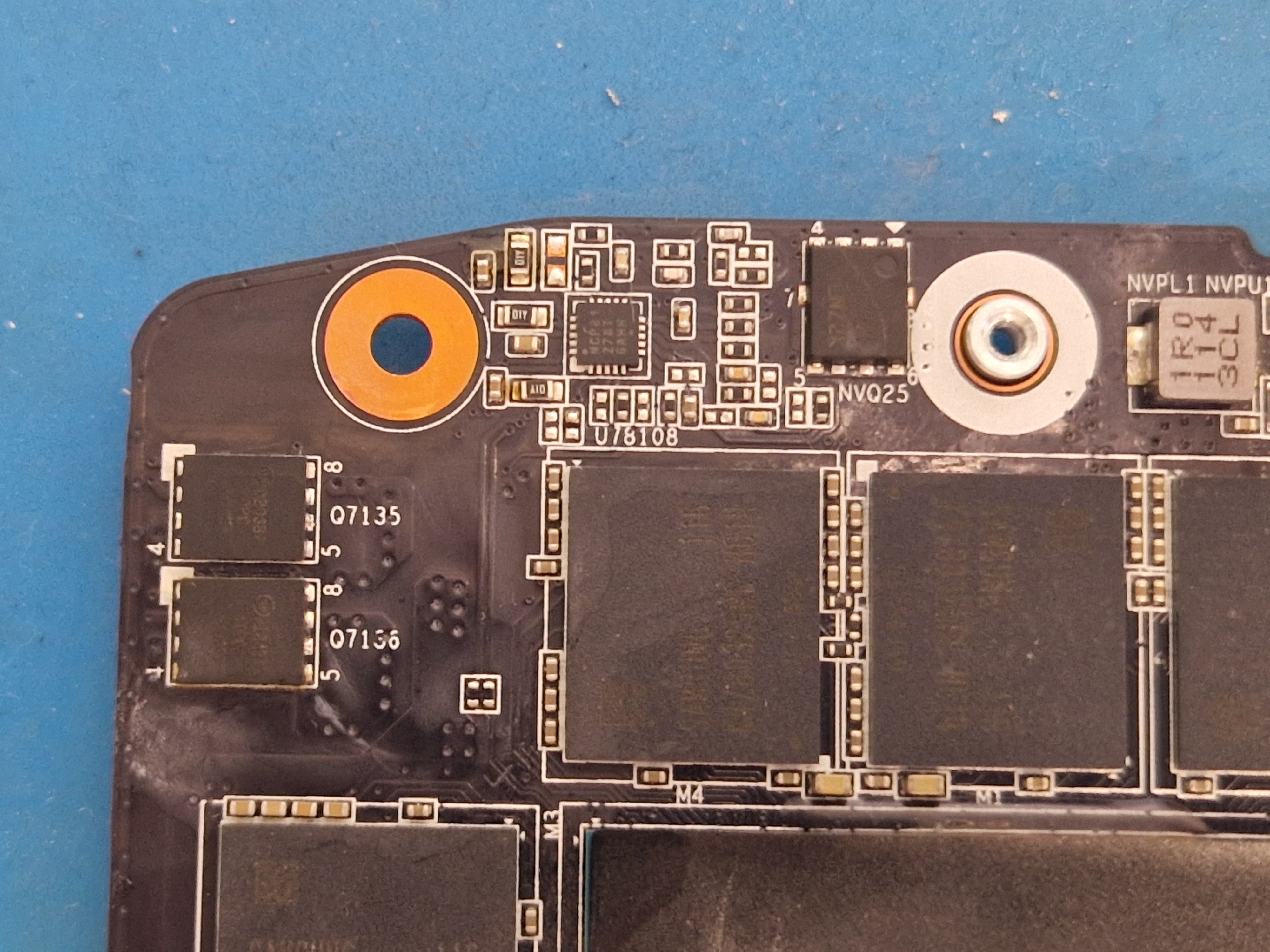 Początkowo nie było reakcji na wpięcie zasilacza, płyta martwa. Po krótkiej diagnostyce udało mi się znaleźć zwarcie między główną sekcją zasilania, a cewkami NVPL2-NVPL3 - najprawdopodobniej wspólna sekcja zasilania VRAM.