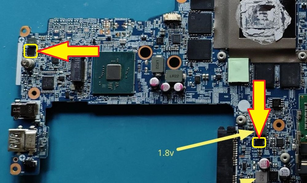 With the bench PS connected, current draw is 190mA. Pressing the power button causes the current draw to increase to 280mA, but laptop does not turn on.