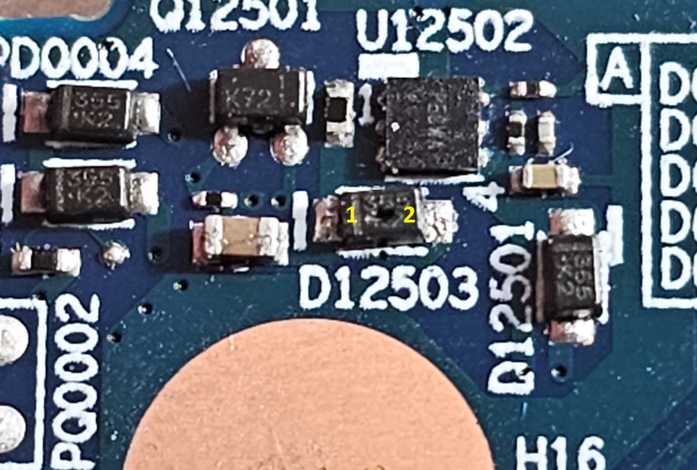 - Measure the resistance to ground on pin 1 of diode D12503.