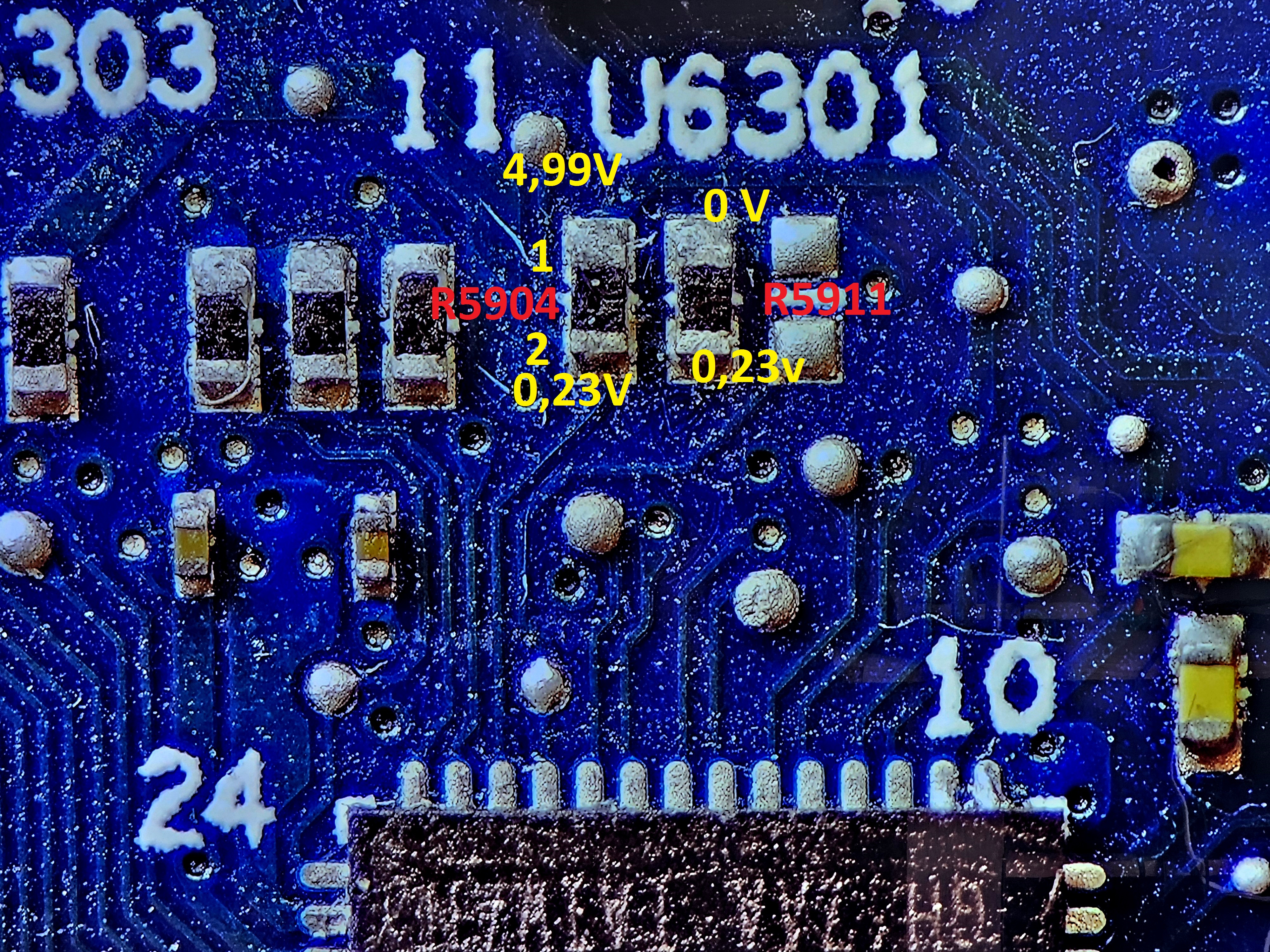 ostroda1981 написав:ciągle jednak na pinie 21 jest bardzo niskie napięcie 0,24V i tu mam pytanie ...patrząc na schemat Pin 21 połączony jest z rezystorem R5904 i R5911 , o ile piny na załączonym zdjeciu są prawidłowe wygląda na to , że może być uszkodzony R5901 ? Czy się mylę ?