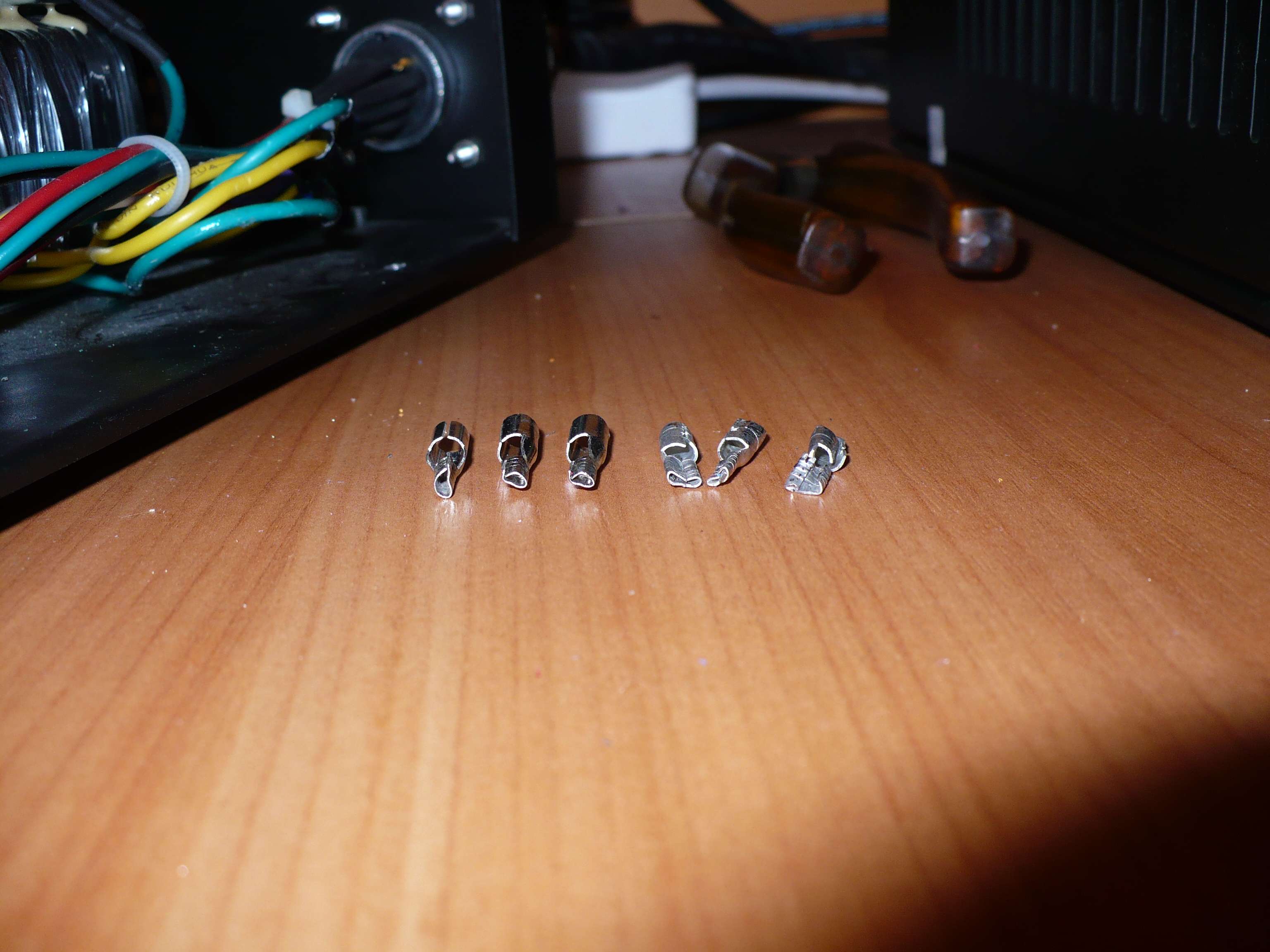 Gwarancją się skończyła :D może nie każdy z tego powodu byłby zadowolony, ale ja akurat tak mam. Rozebrałem stację chcąc poprawić wcześniej opisane końcówki, ale coś mnie tknęło żeby sprawdzić jakość zakucia i wyszło szydło z worka, końcówki od strony trafo były źle (niedbale) zaciśnięte, z jednej z nich przewód wysunął się palcami, to te trzy z lewej na foto:
