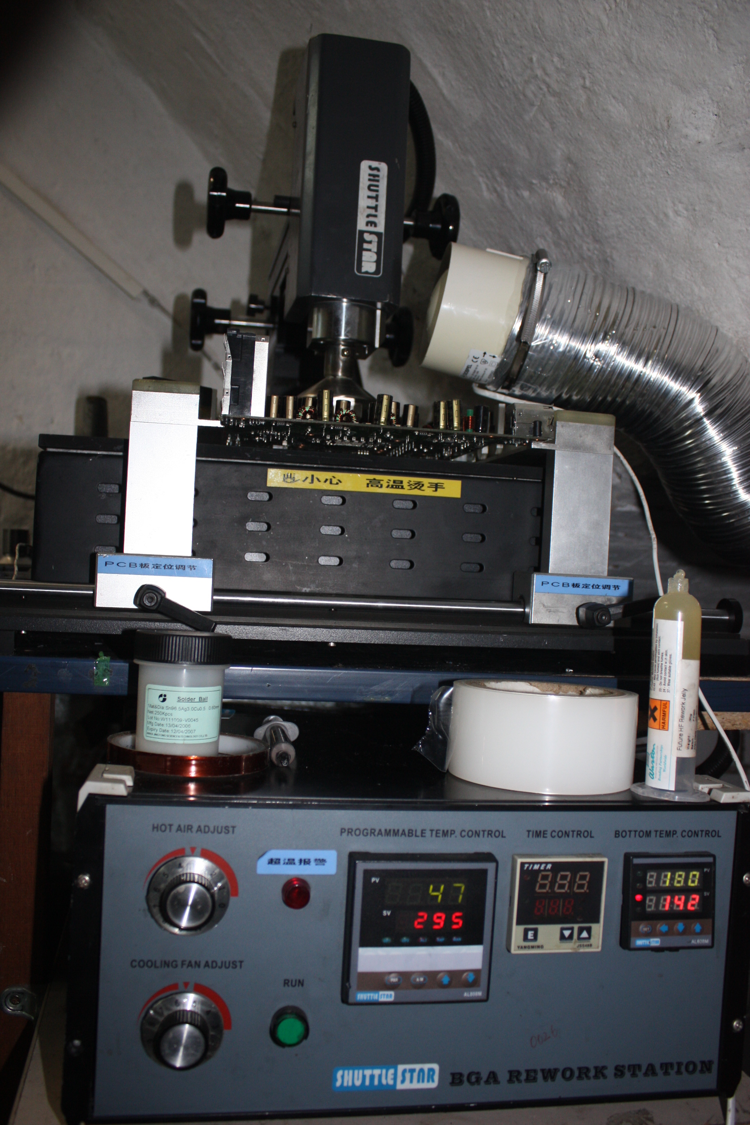 Sprzęt jakim dysponujemy to lutownica shuttle star- nie wiem co to za model,bo kupiliśmy bardzo okazjonalnie.Sprzęt jest 100% sprawny,piec jest duży i grzeje aż miło.Z góry dmucha powietrzem.Wstępnie układy z płyt już podnoszę ale mam parę problemów.