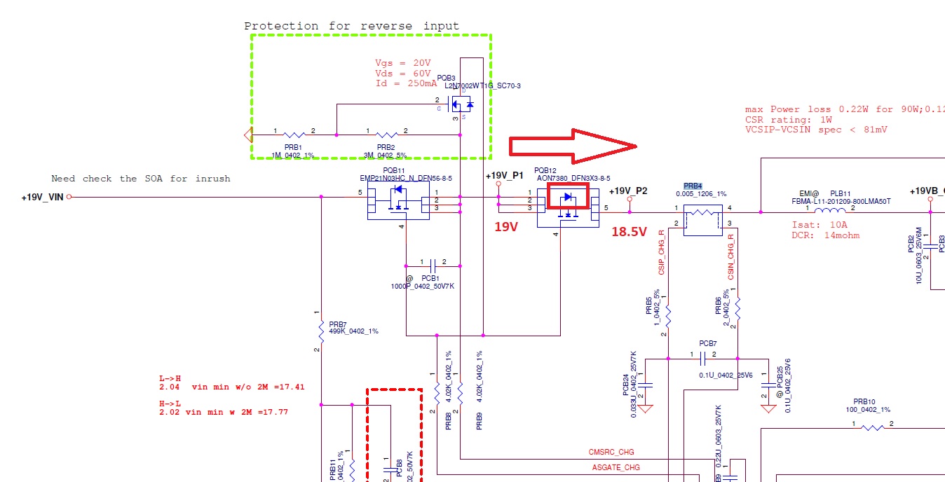 Ten obwód jest naprawdę bardzo prosty w działaniu i nie ma się co spodziewać tutaj żadnych cudów - na n. 18 chargera PUB1 wchodzi 19V przez diodę PDB1 i rezystor PRB25, następnie na wejście ACIN (n. 1) podawane jest napięcie z dzielnika PRB7/PRB11 (około 2.2V), które służy do detekcji podłączonego zasilacza/ładowarki. W tym momencie charger PUB1 załącza tranzystory wejściowe PQB11 i PQB12, podając na ich bramki napięcie ok. 26V - napięcie to generowane jest wewnątrz układu z napięcia zasilania 19V za pomocą tzw. pompy ładunkowej, której aktywnym elementem jest kondensator PCB9.