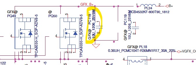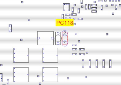 Laptop nie reaguje na włącznik. Po podłączeniu zasilania pulsuje dioda na zasilaczu. Inspekcja płyty głównej kamerą termowizyjną wykazał grzanie się mosfetów PQ6 i PQ7 i zwarcie na mosfecie PQ7, rezystorze PR14, mosfecie PQ5, cewce PL22 i kondensatorach PC9, PC9, PC10, PC11. PC181, PC182 oraz mosfetach PQ15 i PQ16
