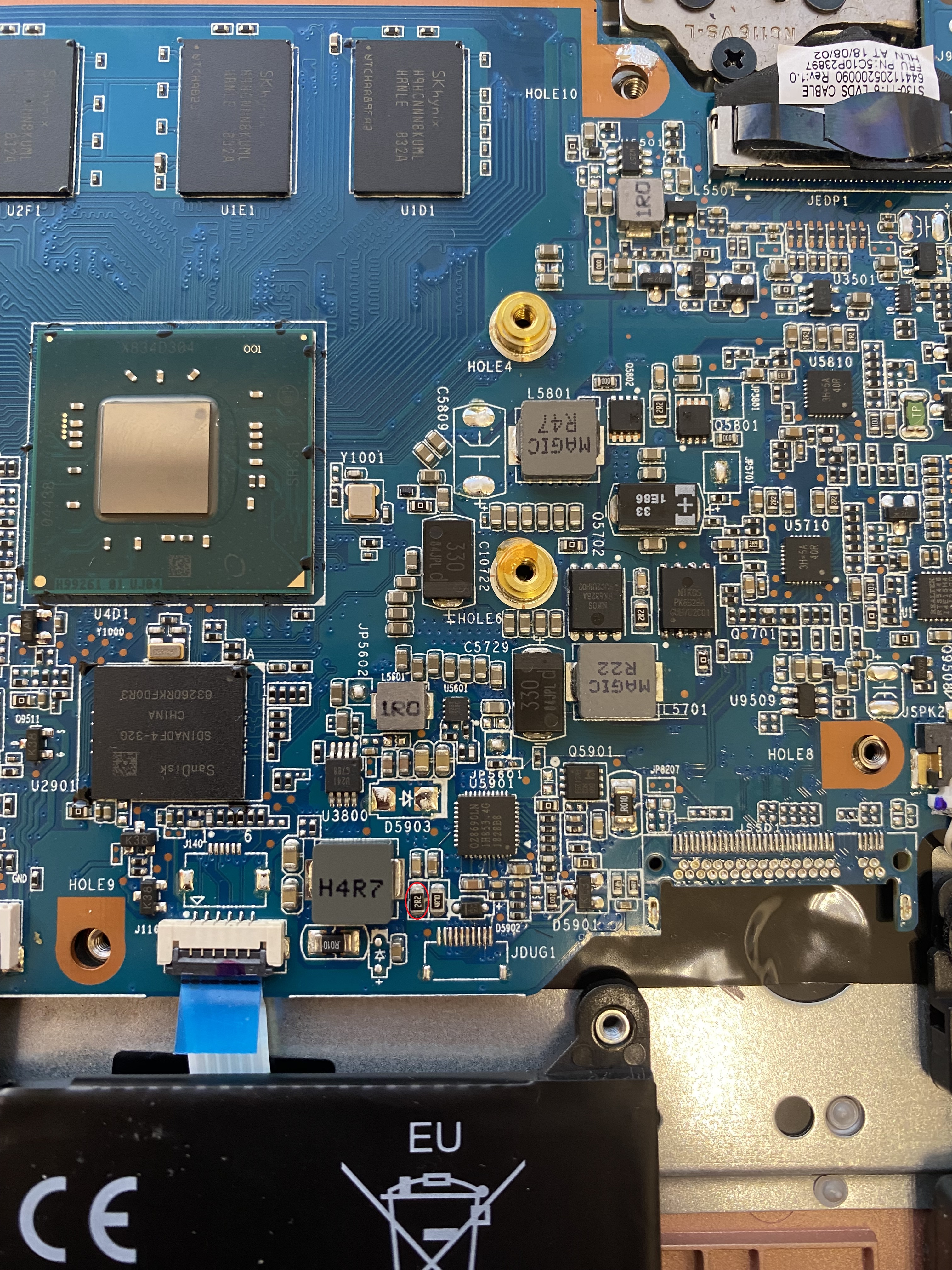 Laptop nie reaguje na włącznik. Po podłączeniu ładowarki od czasu do czasu mrugnie dioda sygnalizująca żródło zasilania. Oględziny płyty głównej kamerą termowizyjną wykazały grzanie się rezystora zaznaczonego na zdjęciu ale tyklo gdzy wpięta jest bateria. Na cewce L5701 jest 50 Ohm. Na mosfet z lewej strony wchodzi 20V na wyściu 0V i tam rezystancja też 50 Ohm wyglada to na nie pełne zwarcie.