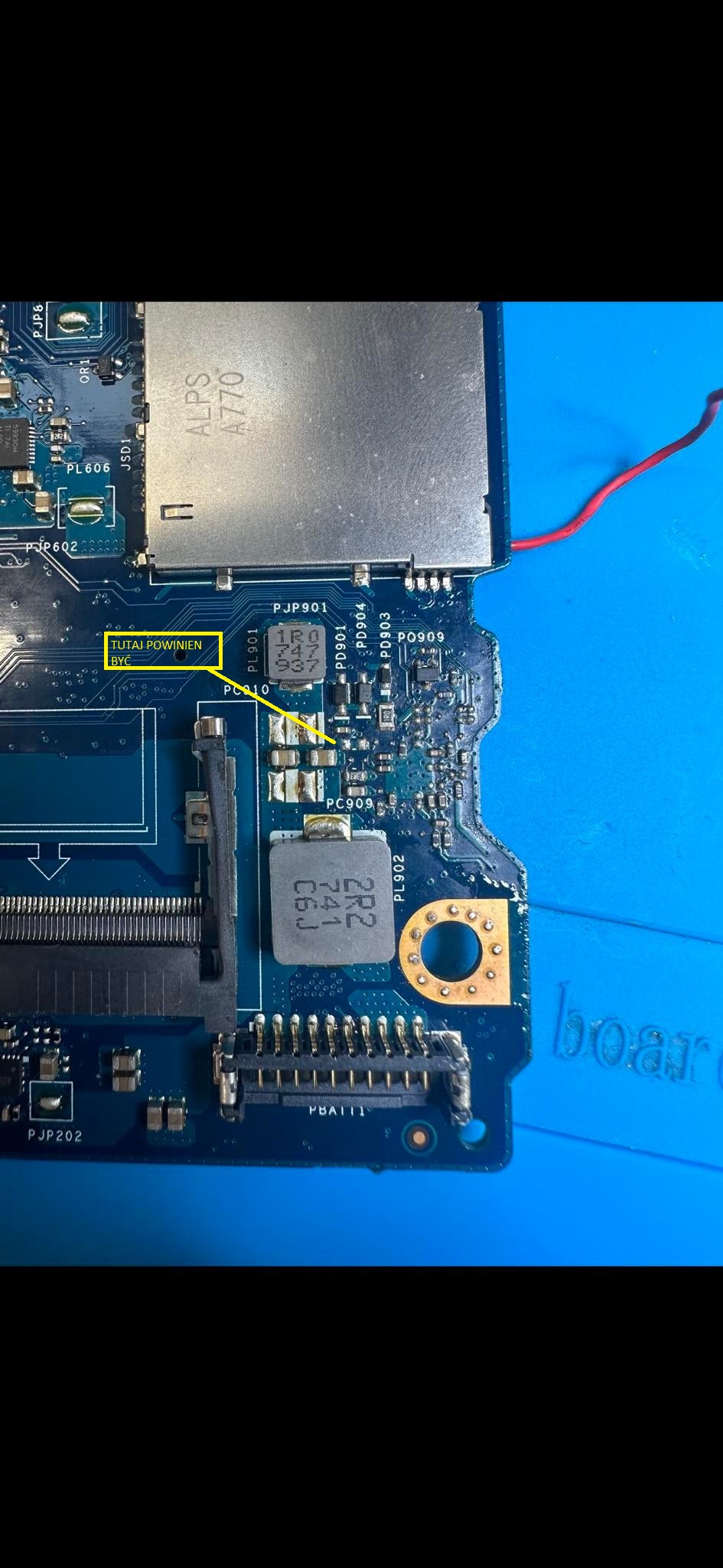 PR945=100K - nie mogę zlokalizować go, przechodzi przelotką w drugą strone natomiast znajduje się tam pole łączące się z drugim ścieżką, sprawdziłem to poprzez przyłożenie jednej sondy pomiarowej do rezystora pr944 i drugą do tego pola