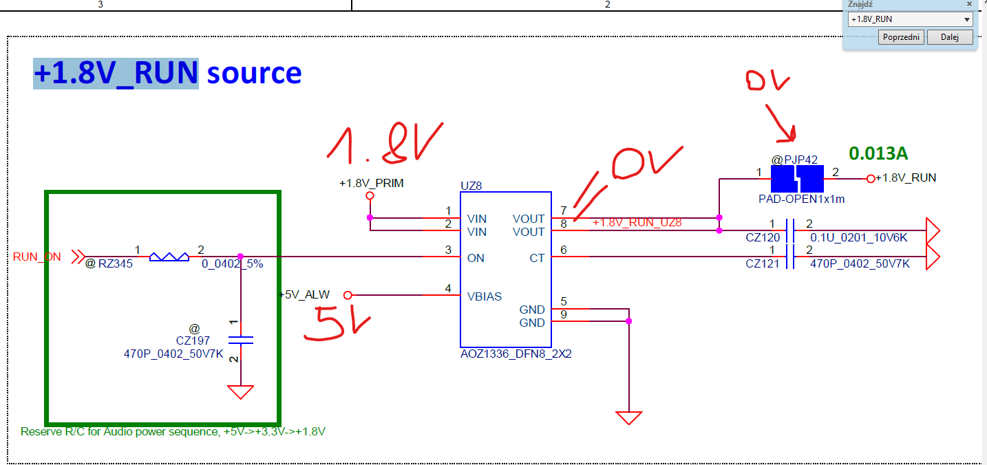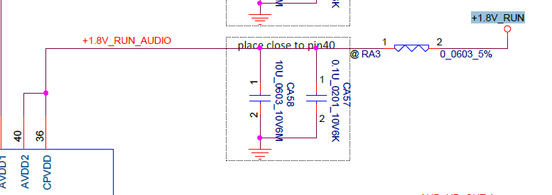 I see 36 pin should be on 1.8 voltage. This track is leading to +1.8V_RUN source - UZ8 chip (8C0A 621U - Reserve R/C for Audio power sequence).