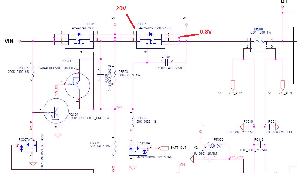 Laptop nie reaguje na włącznik. Głowna linia zasilania nie jest zwarta. Na mosfer PQ302 wchodzi 20V a wychodzi tylko 0.8V takim samym napięciem zasilane