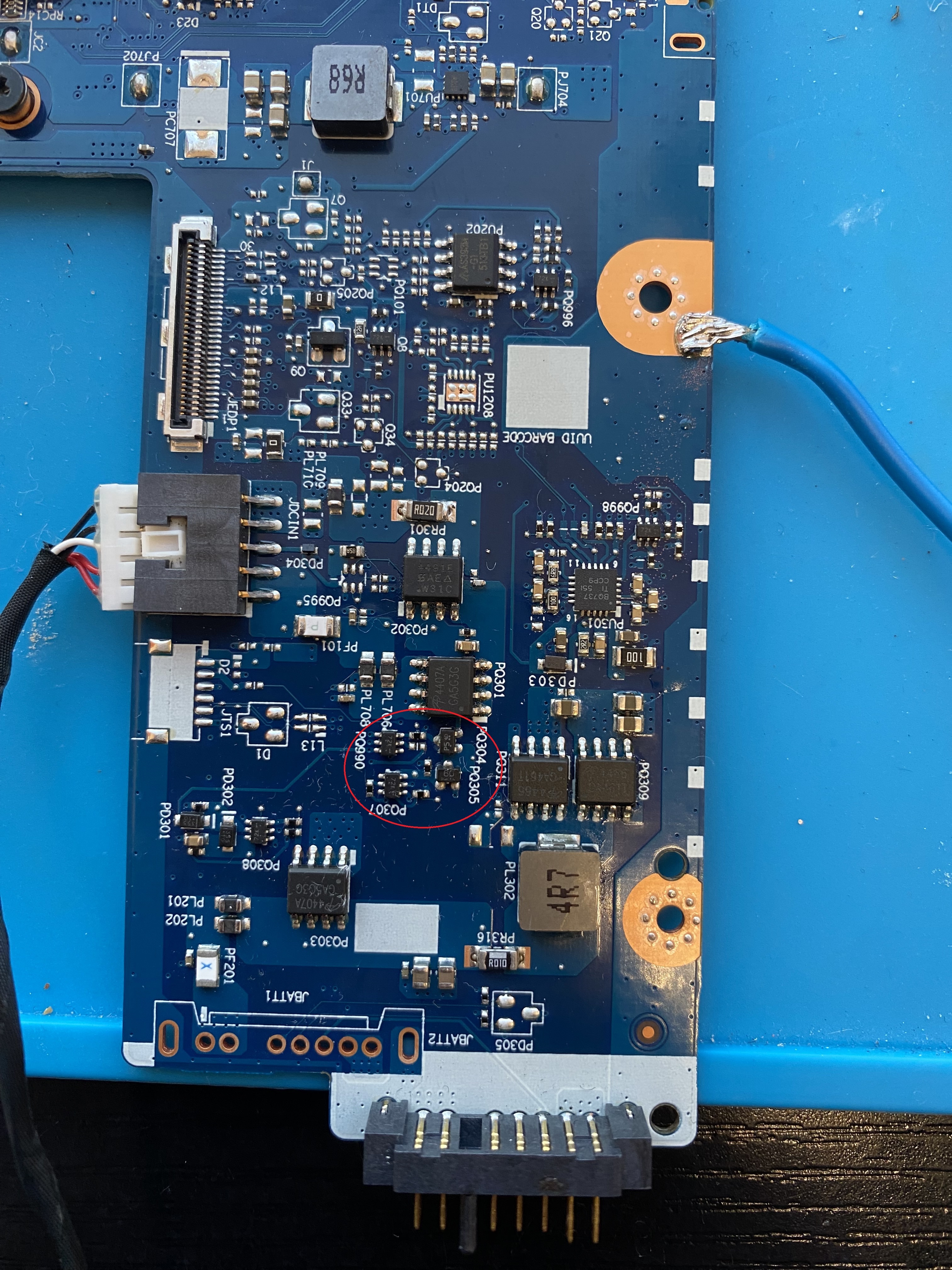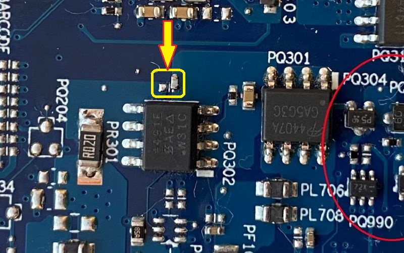 Po podaniu 20V na rezystor PR301 płyta się uruchamia. Wymieniłem mosfet PQ302 ale jest to samo.