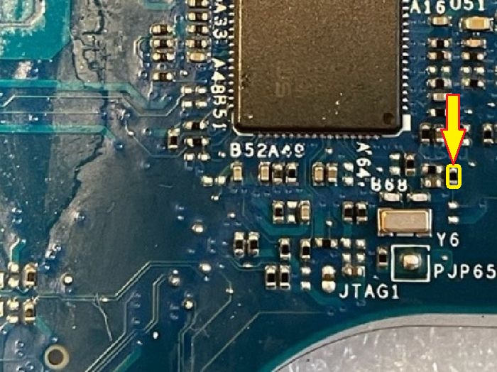 - Measure the voltages to ground on both pins of highlighted resistor: