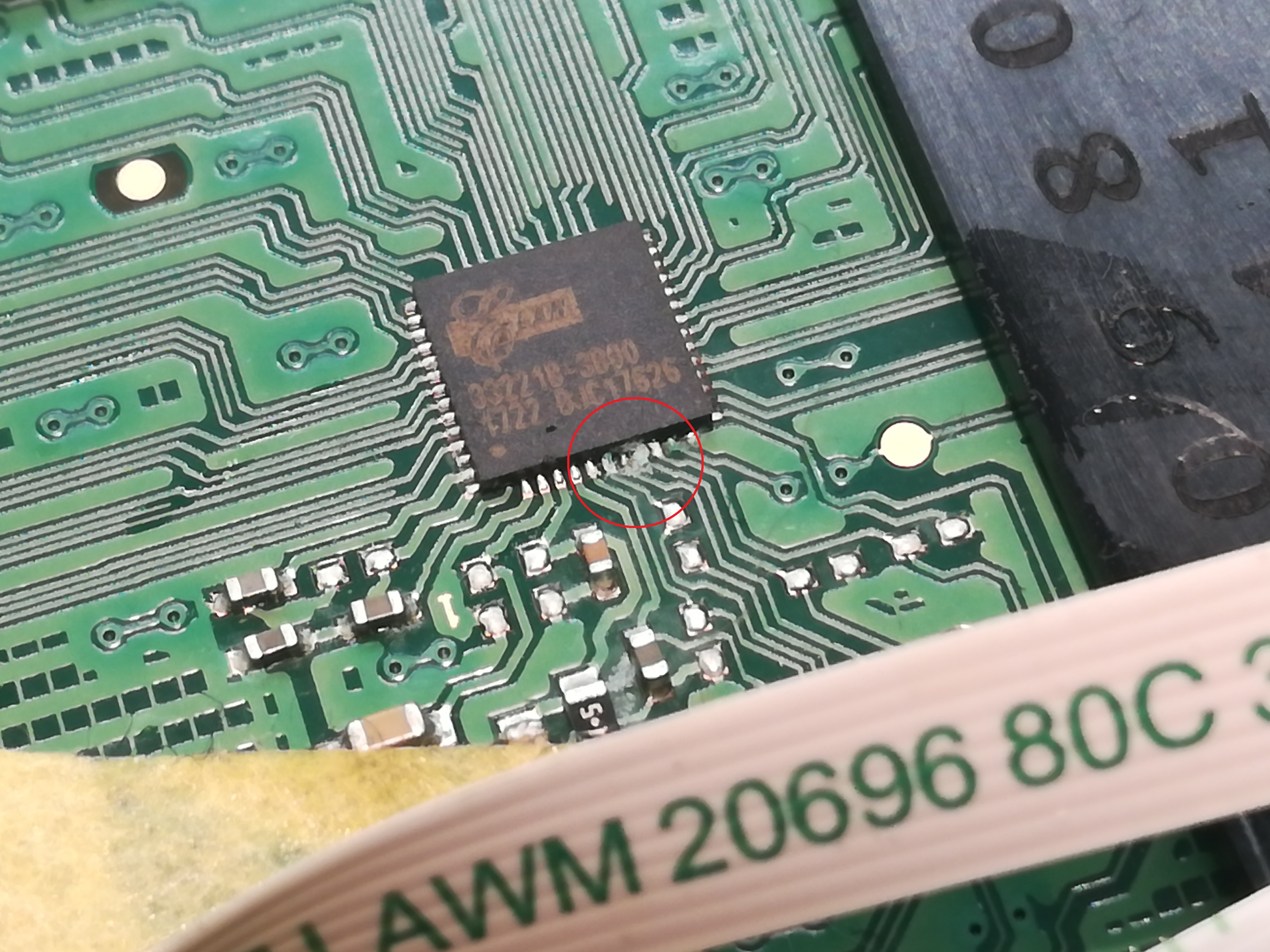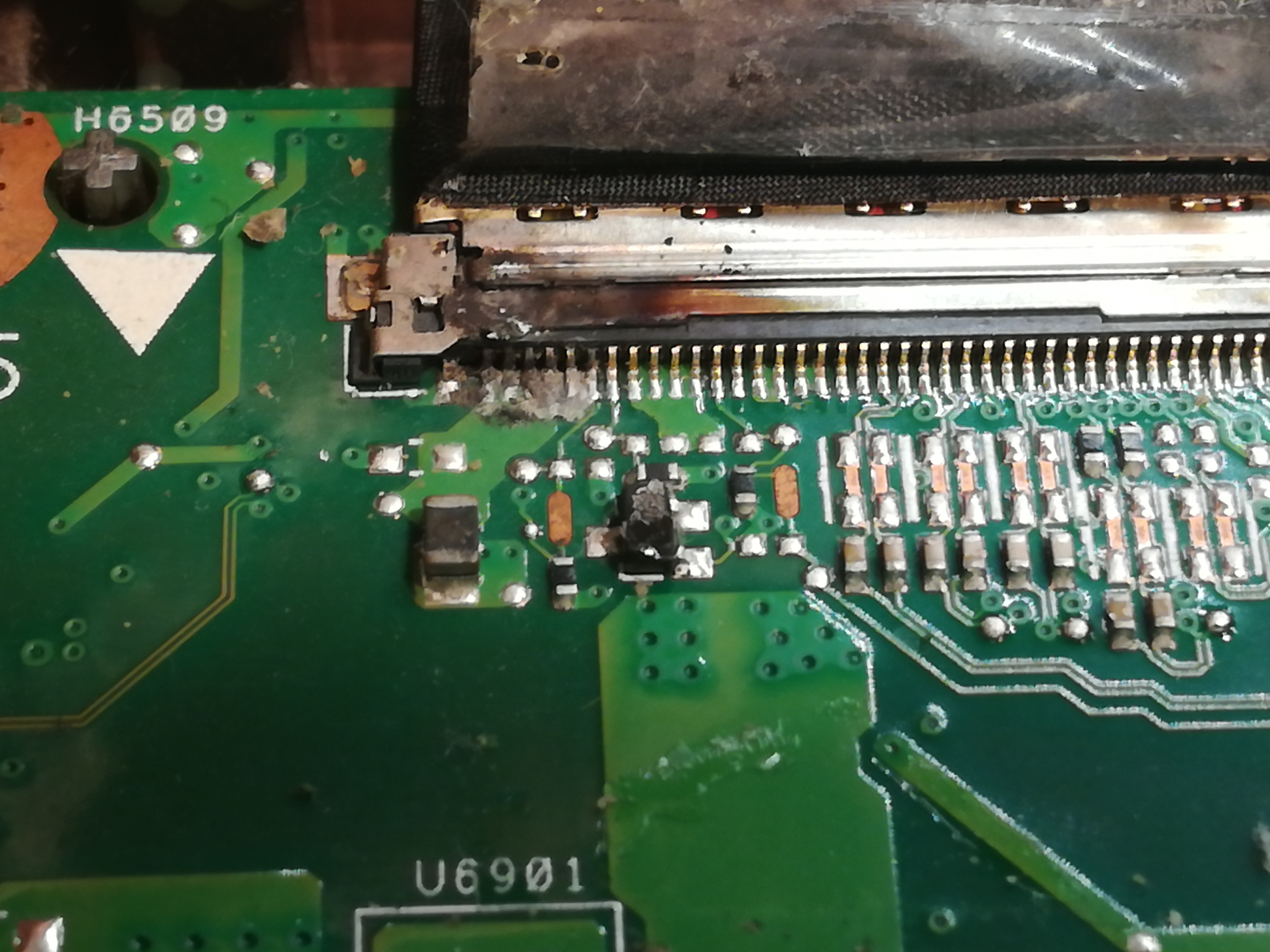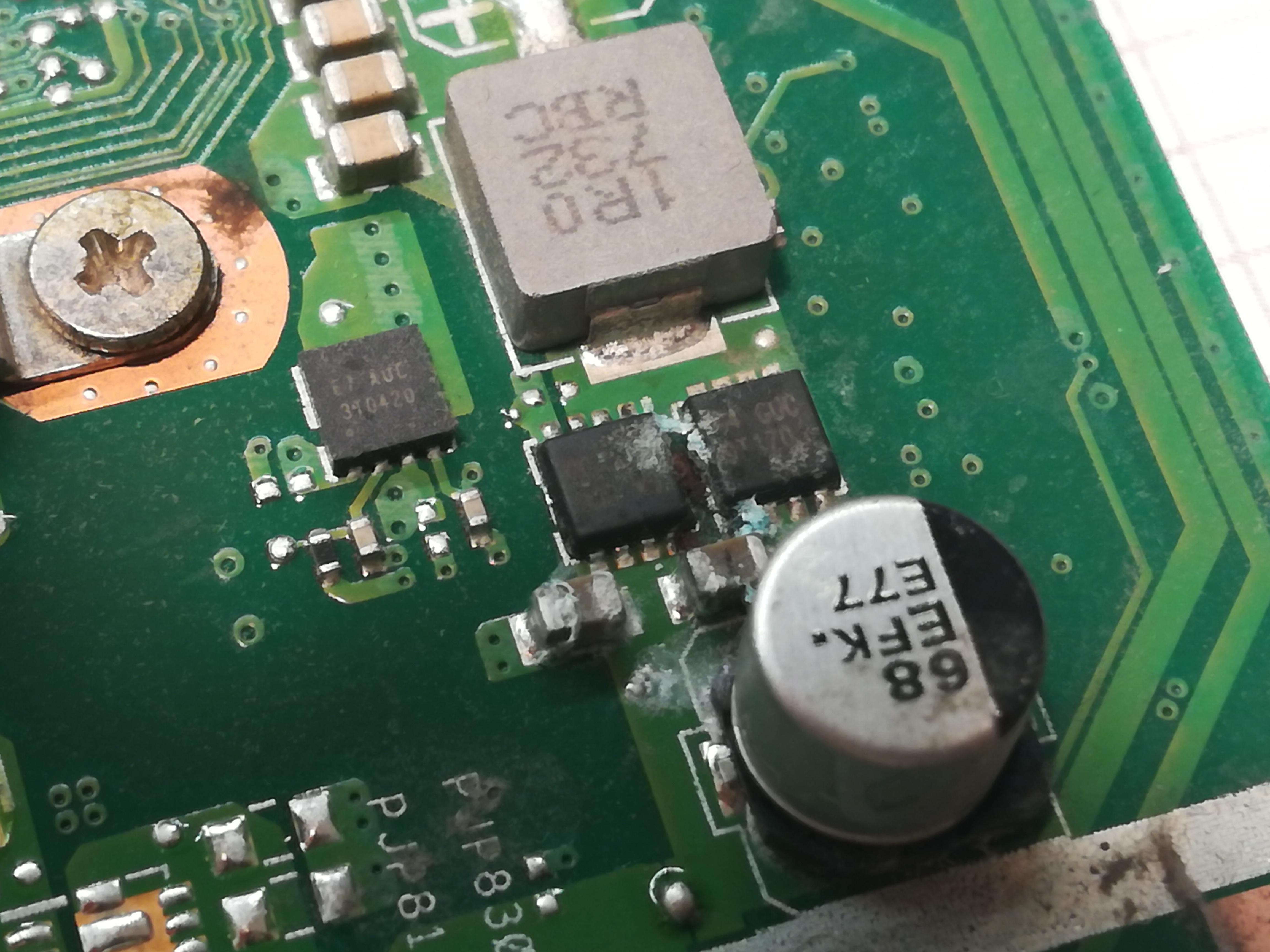 Do tej pory udało mi się go wyczyścić, usunąć korozję i skorodowane elementy, sprawdzić czy tranzystory nie mają przebić. Znalazłem też wypalenie na złączu do matrycy. Śledząc board view widziałem, że pomiędzy zasilaniem inwertera, a masą jest pin sterujący z PCH ale zmierzona na nim rezystancja jest wysoka, rzędu dziesiątek kiloomów. Zmierzone rezystancje na cewkach też nie sugerują uszkodzonej hybrydy.
