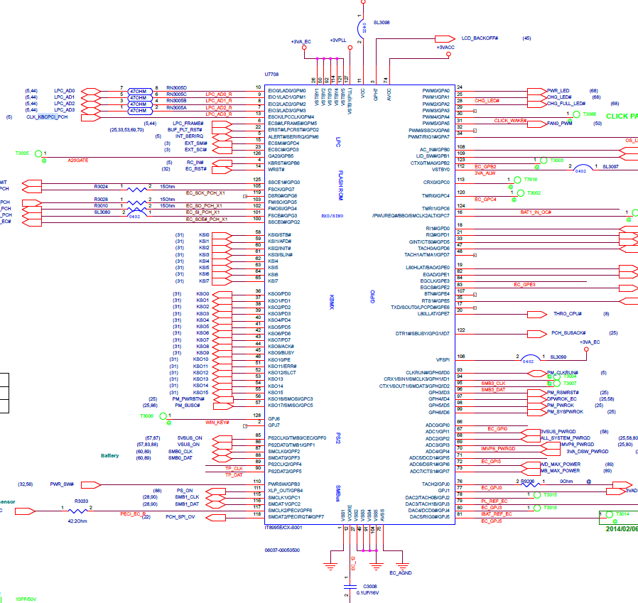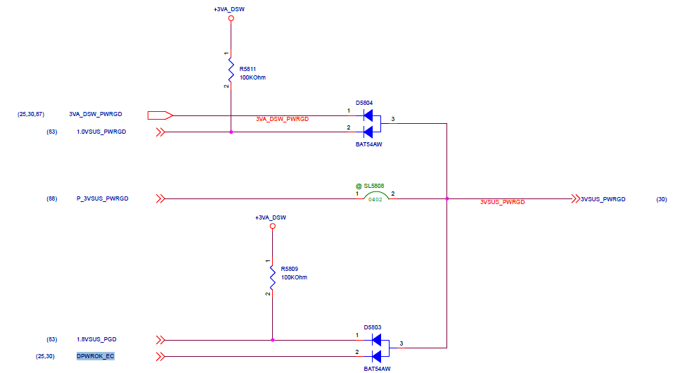 Jednak coś z KBC. Naturalne, że jeśli na podniesionej diodzie D5803 na DPWROK_EC (97 pinKBC) jest 0,2V to 3VSUS_PWRGD musi spaść do ok 1/11 napięcia 3VA_DSW co wynika z dzielnika choćby rezystorów PR8802 (100k) i RN2502 (10k).