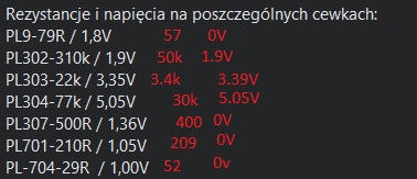 Po naprawie(wymiana skorodowanych elementów, poprawa ścieżek i zabezpieczenie soldermaską UV) podziałała kilka miesięcy i przestała się włączać. Po podłączeniu zasilacza znikomy pobór prądu, pojedyncze mA. Wciśniecie włącznika powoduje zapalnie diody zasilania. Pobór prądu wzrasta minimalnie. Kamera termowizyjna nie pokazuje żadnego elementu wyróżniającego się, co jest raczej normalne przy płynącym tak małym prądzie. Przytrzymanie włącznika powoduje zgaśniecie diody zasilania. Przeszukując internet trafiłem na wpis jednego z użytkowników z wynikami jego pomiarów. Na czerwono odniosłem swoje wyniki, pomiar przy świecącej diodzie: