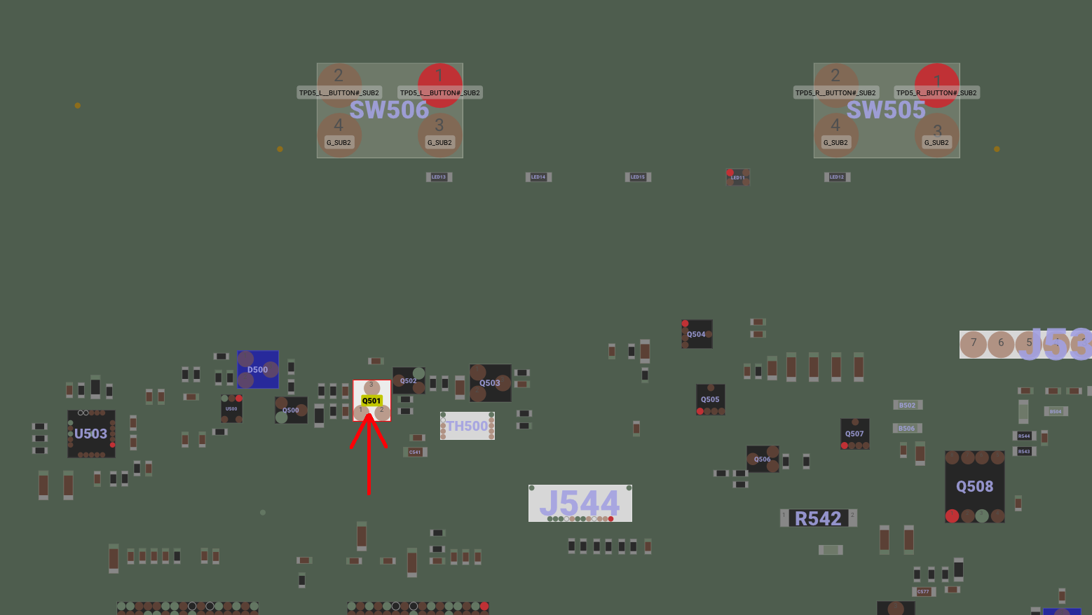 Vogelek23 написав:Proszę zmierzyć napięcia do masy na wszystkich wyprowadzeniach tranzystora Q501 (zaznaczony strzałką) przy podłączonym zasilaczu i braku podświetlenia (komputer włączony do obrazu).