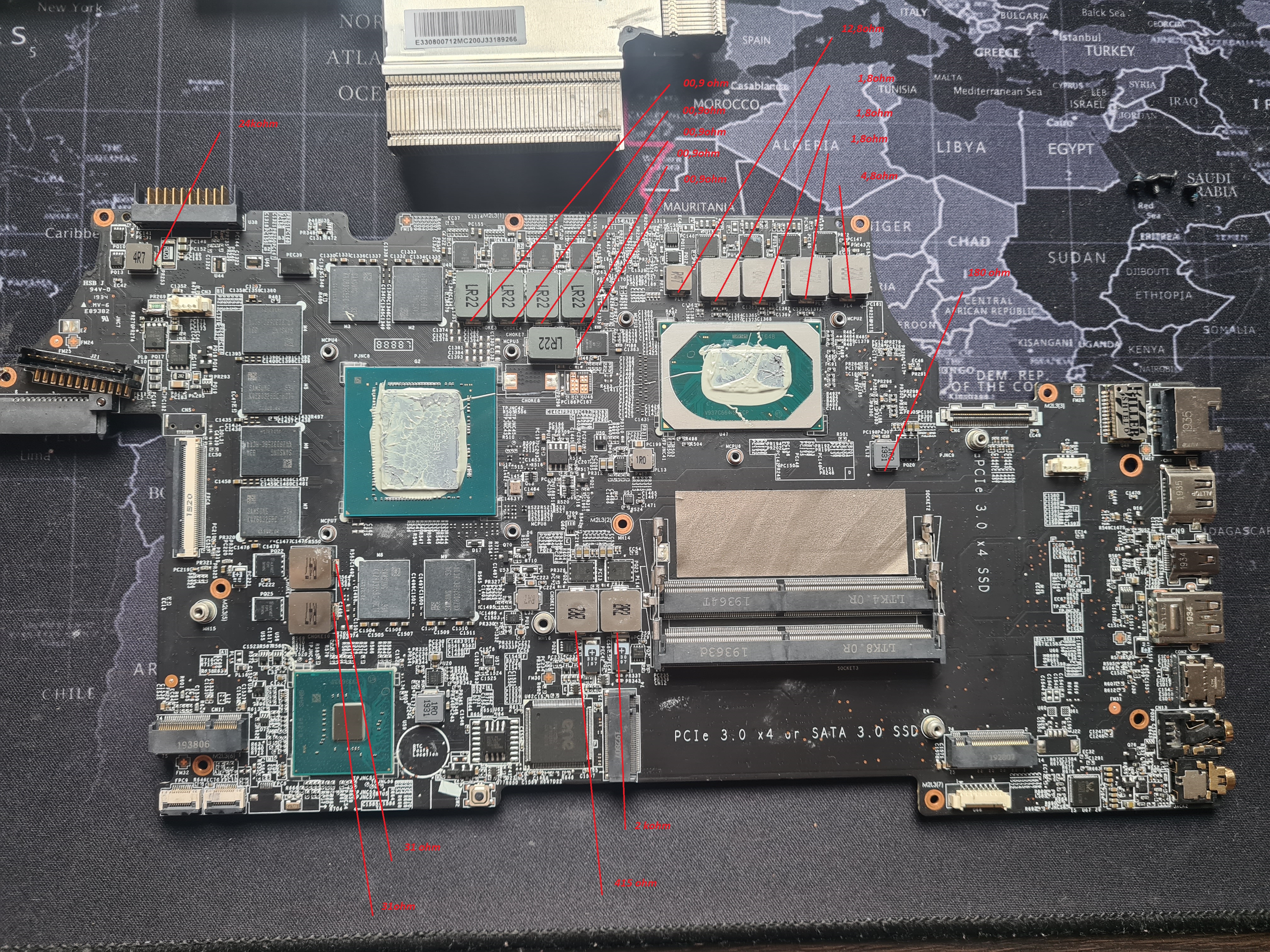 Witam mam laptopa po zalaniu był w serwisie i stwierdzili ze płyta do wymiany . Widać topnik do około kbc i cynę przy masie i rezystorze pomiarowym niestety nie mam oryginalnego zasilacza nie jestem w stanie zobaczyć co się z nim dzieje po podłączeniu do sieci .Zasilacz oryginalny będę miał dopiero we wtorek. Zrobiłem wstępnie pomiary cewek proszę o sprawdzenie i co jeszcze mogę pomierzyć przed podaniem mu zasilania. Zalanie widać z drugie strony było czyszczone, Głownie widać zalanie przy układzie ,,1125c ti,, wydaje mi się ze jest to przetwornica 3v i 5v ale nie jestem pewnien