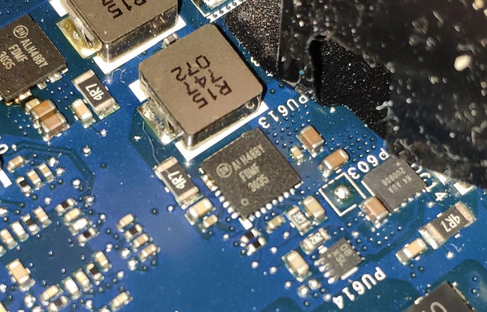 - Measure the resistance to ground on pad 10 on the place of chip PU613.
