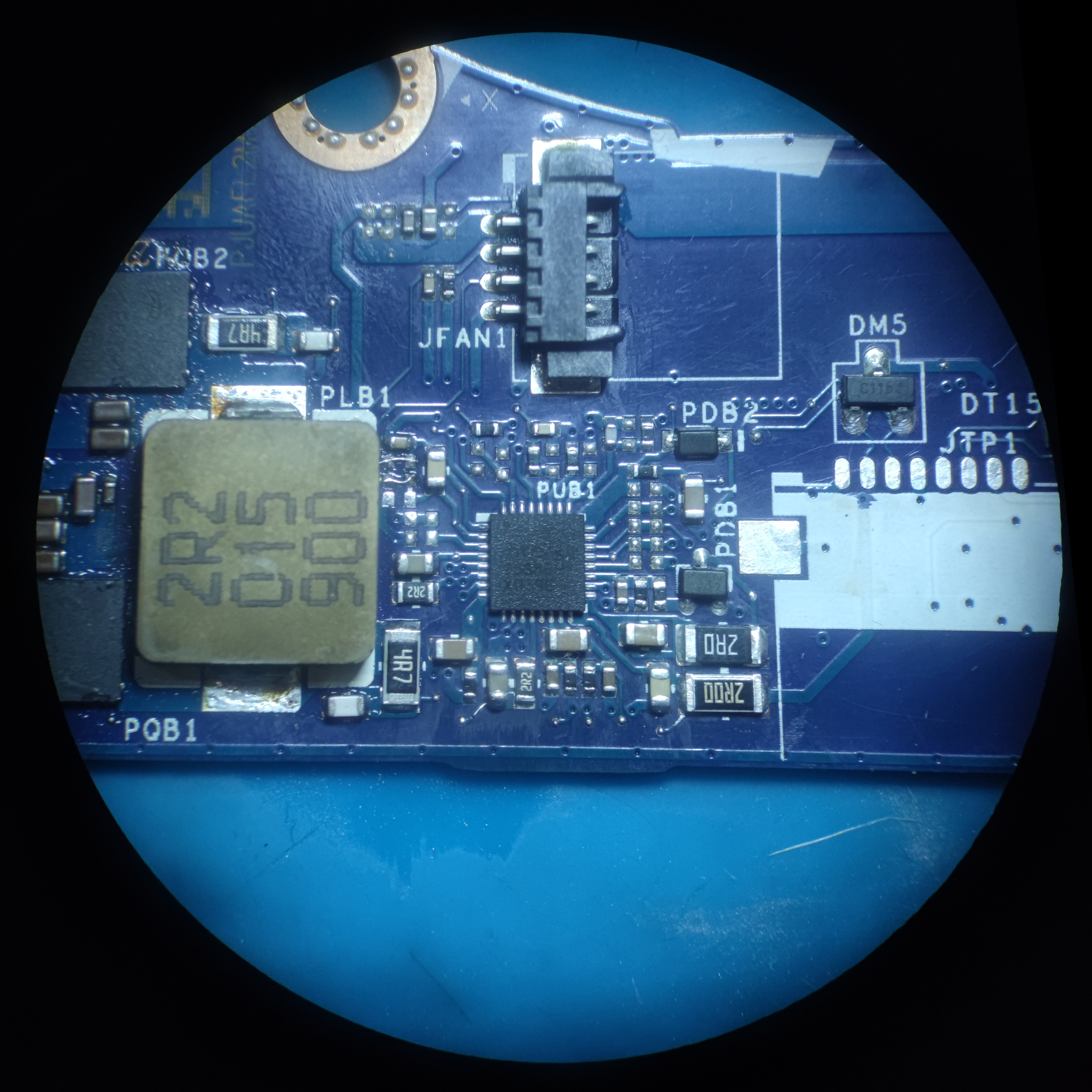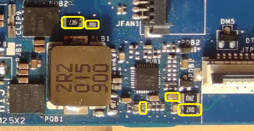 Komputer trafił do mnie po zalaniu w okolicach chargera, przetwornicy 3.3v, oraz obok złącza baterii. Płytę wyczyściłem, wymieniłem charger i rezystory na lini rezystora pomiarowego(na obecny moment są zrobione zworki zamiast 3 ohm), przetwornicę 3.3v z drobnicą, główny rezystor pomiarowy, oraz tranzystory PQB4(mark. P5) oraz PQB5 (mark. 8N) zidentyfikowane jako LMUN5113T1G oraz LMUN5236T1G zamieniłem odpowiednio TDTA144E oraz PDTC115EU.115.