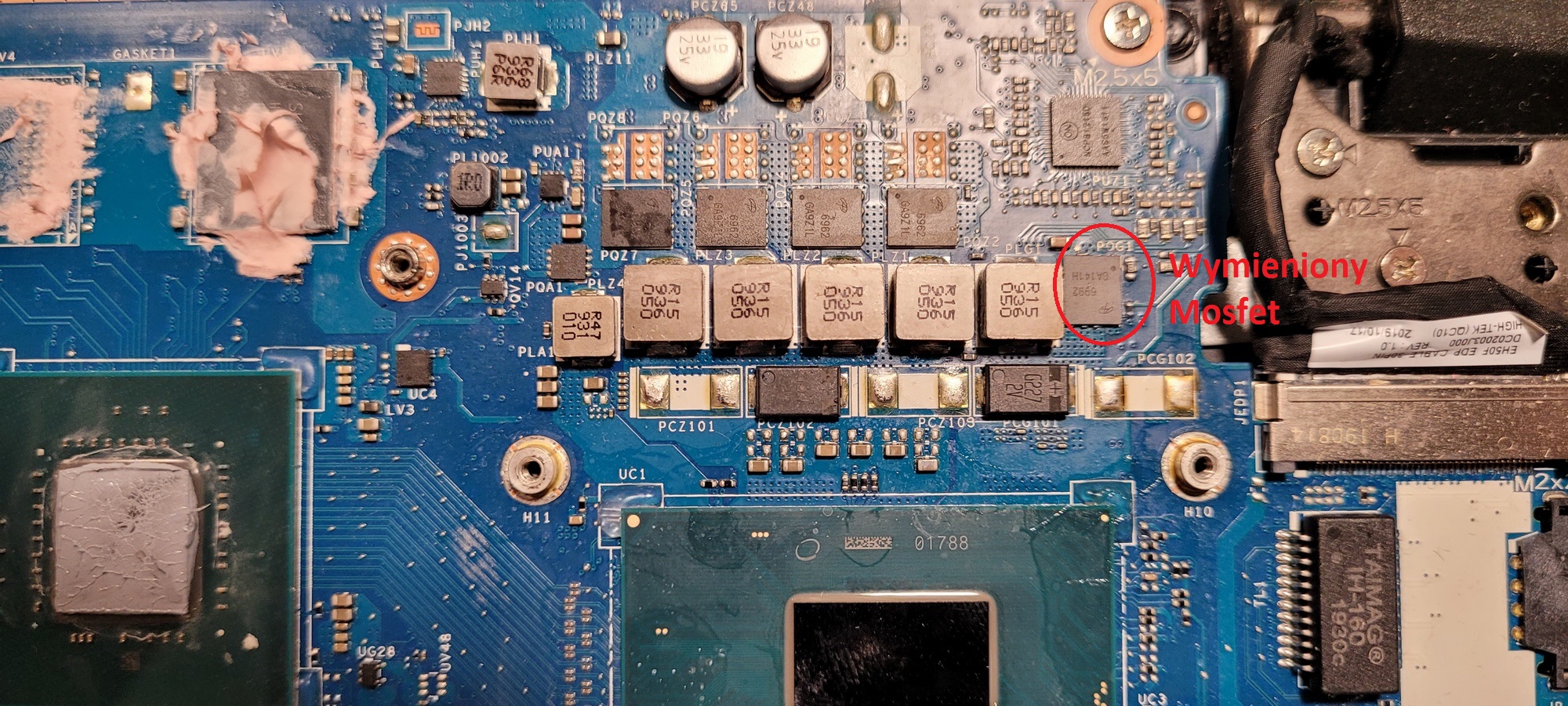 przebicie źródło-dren i do bramki (wymieniony na zamiennik AON6992). Po wymianie mosfetów podświetla się klawiatura, ruszaja wentylatory,