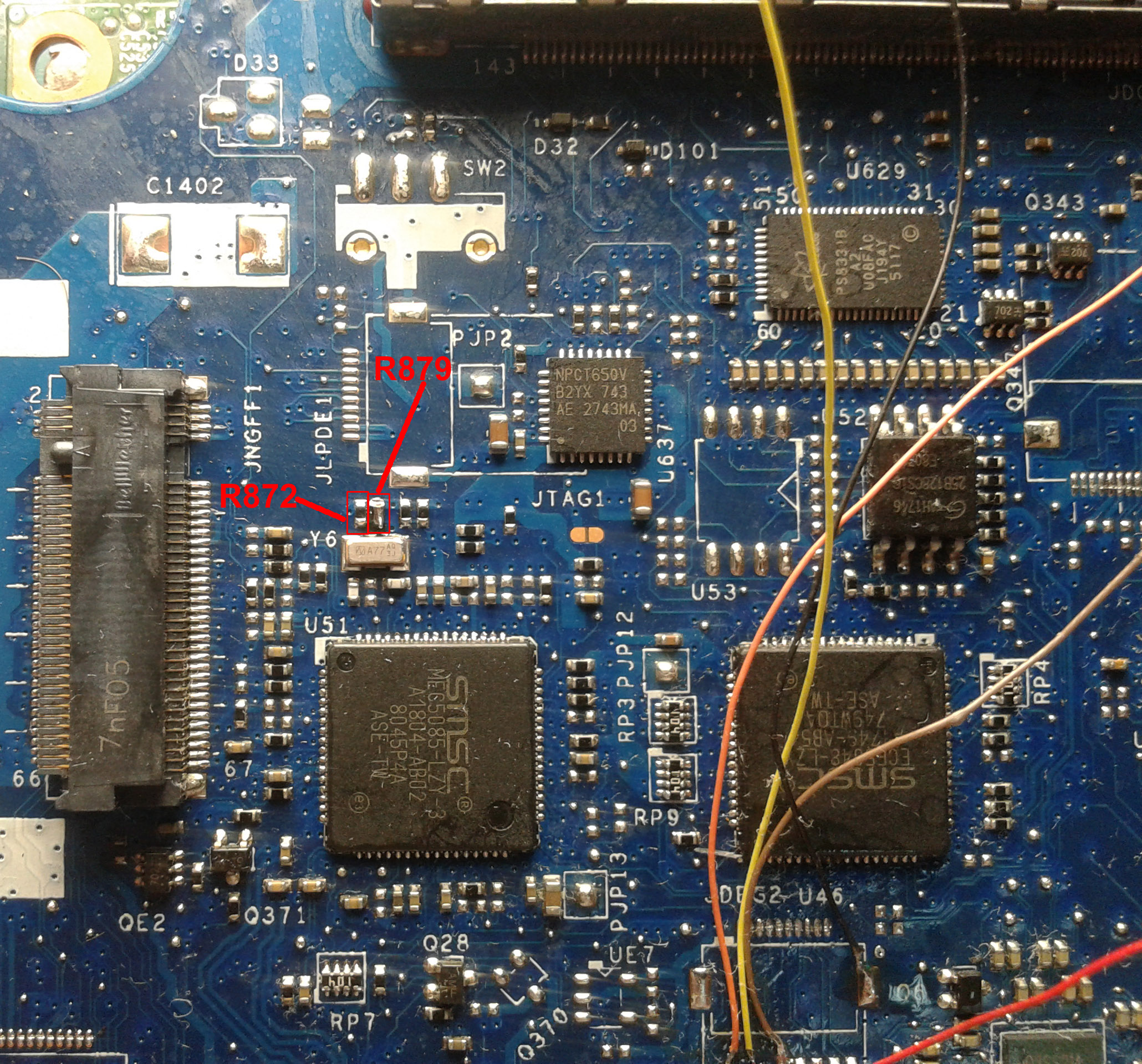 - po zmostkowaniu PQ2 i PU1 przejście pomiędzy pinem gniazda zasilania a PS_ID tj. oporność 33Ω (opornik PR9),