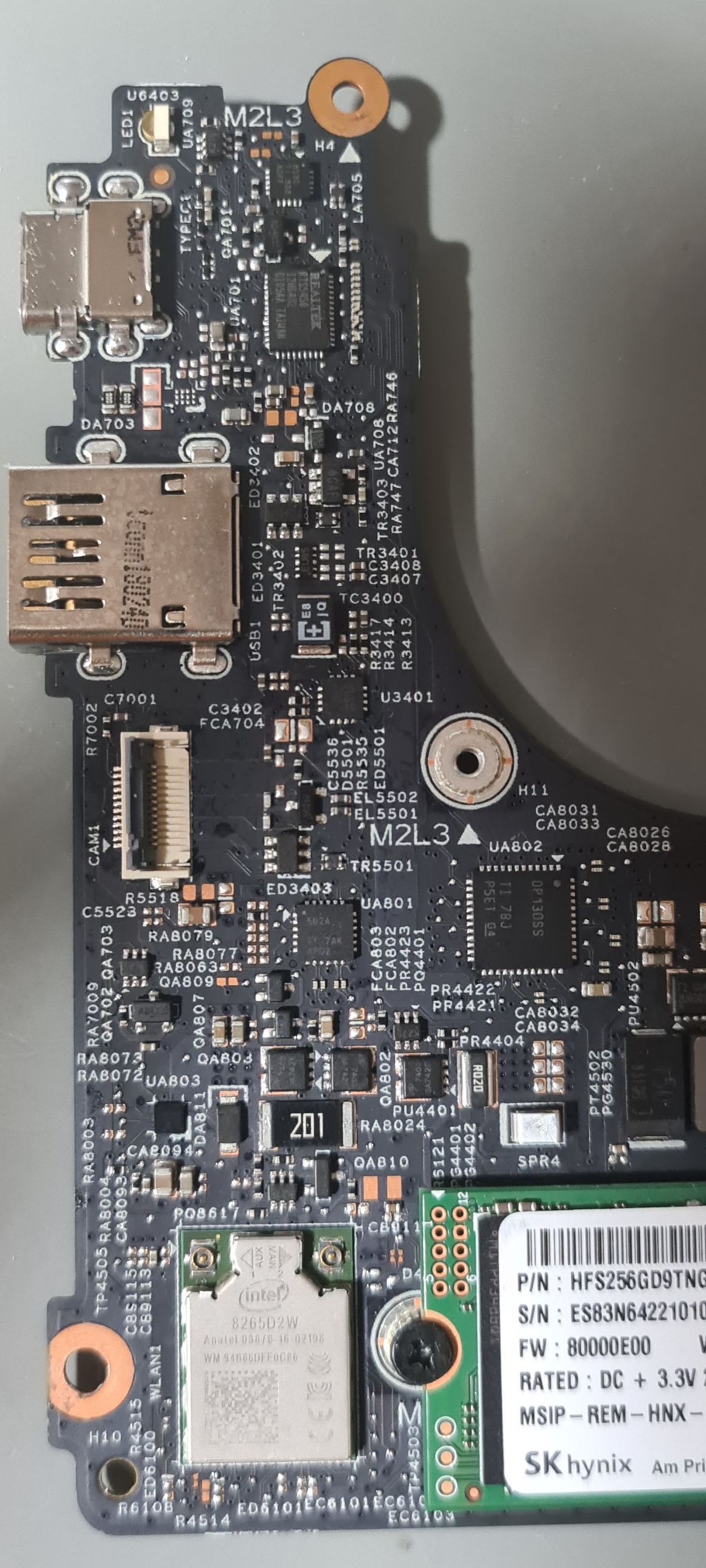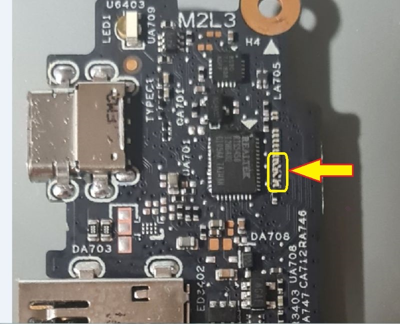 Płyta po wymianie gniazda USB-C oraz układu UA701 (RTS5450) miał dziurę.