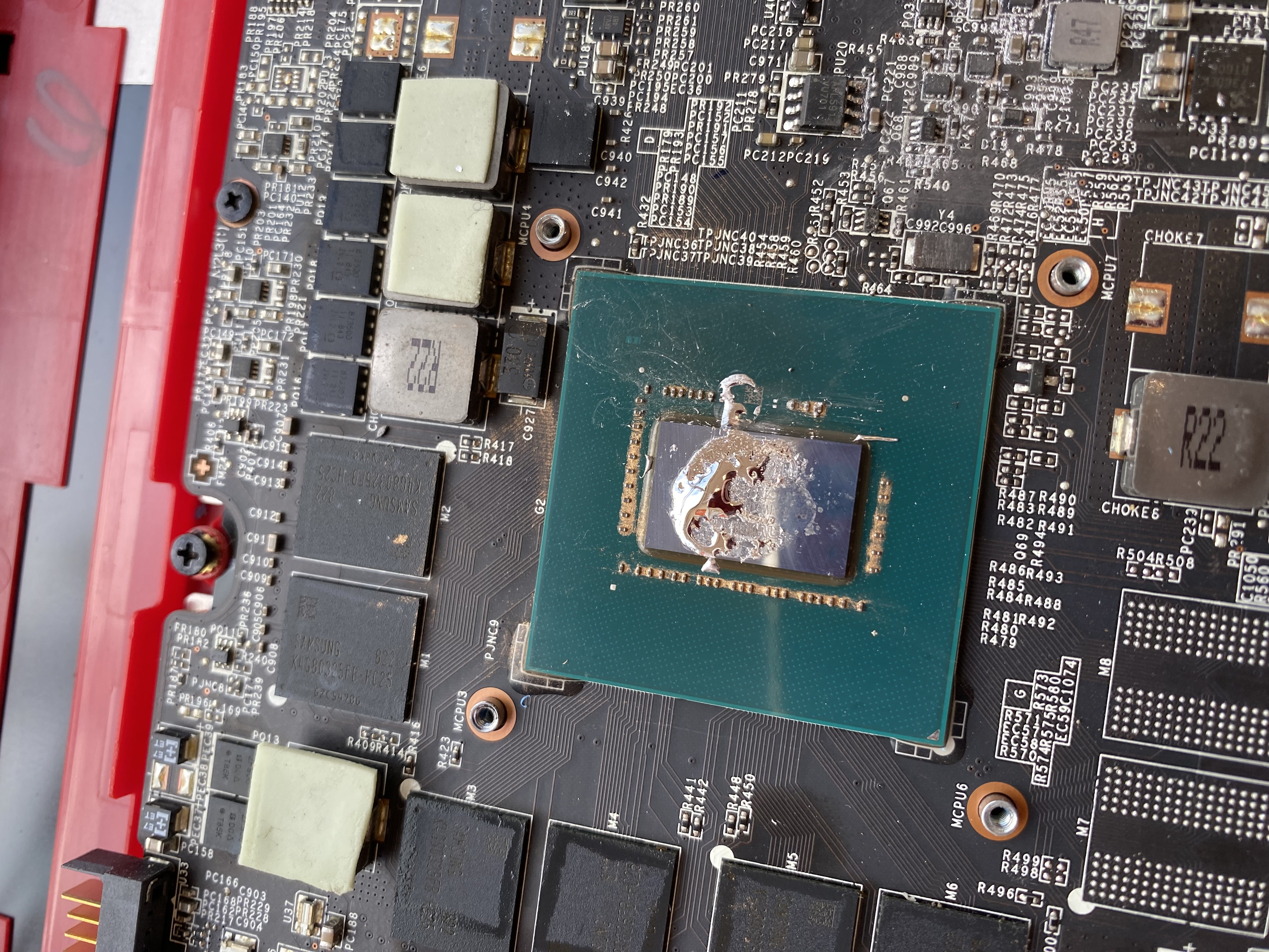 Płyta jest wymazana w ciekłym metalu i paście termoprzewodzącej. Na układzie GPU brakuje 4 kondensatorów co zauważyłem po usunięciu ciekłego metalu który wyciekł spod rdzenia, generalnie dramat. Brakujące kondensatory mogą być przyczyną niewykrywania dedykowanego GTX-a pod systemem ale niekoniecznie ze względu na to, że ciekły metal mógł narobić jakichś zwarć. O dziwo laptop włącza się i działa normalnie na wbudowanym w CPU Intelu. Możliwe, że uzupełnienie kondensatorów na GPU załatwi sprawę ale nie wiem, jakie to są kondensatory i proszę o pomoc w ich zidentyfikowaniu.