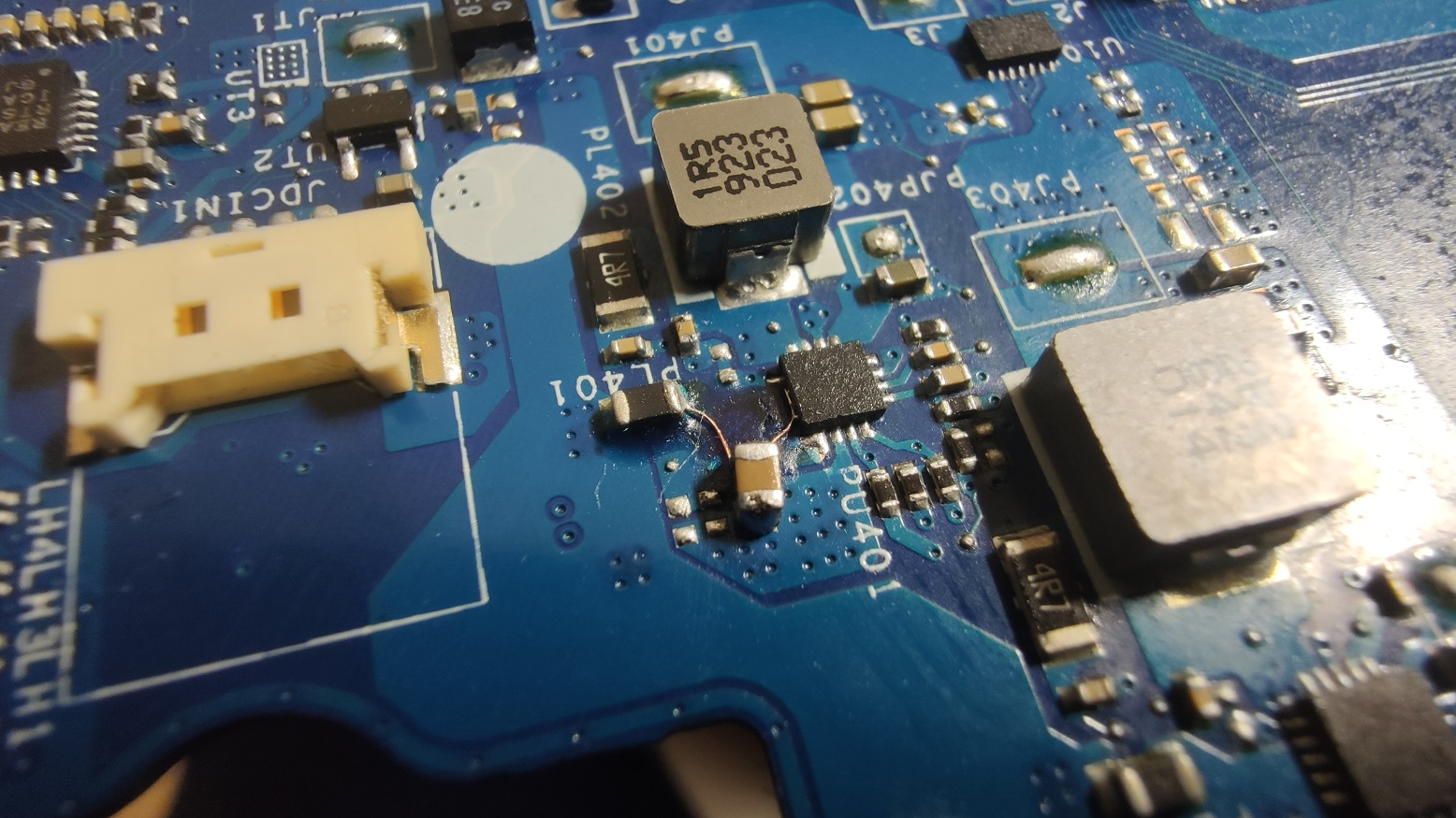 Cześć. Sprzęt jak w tytule, po wymianie w/w elementów brak reakcji. Pod PU401 była dziura, którą wyczyściłem i zabezpieczyłem soldermaską, niestety nie jestem pewien czy jedna przelotka nie powinna być gdzieś podłączona. Brak 3.3V i 5V, zwarć na cewkach nie ma, rezystancje według mnie w normie. Musiałem zasilić KBC przez PJP402 aby dało się zaprogramować, KBC dobrze wlutowane bo zawsze sprawdzam każdy pin pęsetą czy się coś nie rusza. PU401 ma tylko napięcie zasilania i na pin8 - 4.5V, na reszcie pinów 0V. Z góry dziękuję za pomoc.