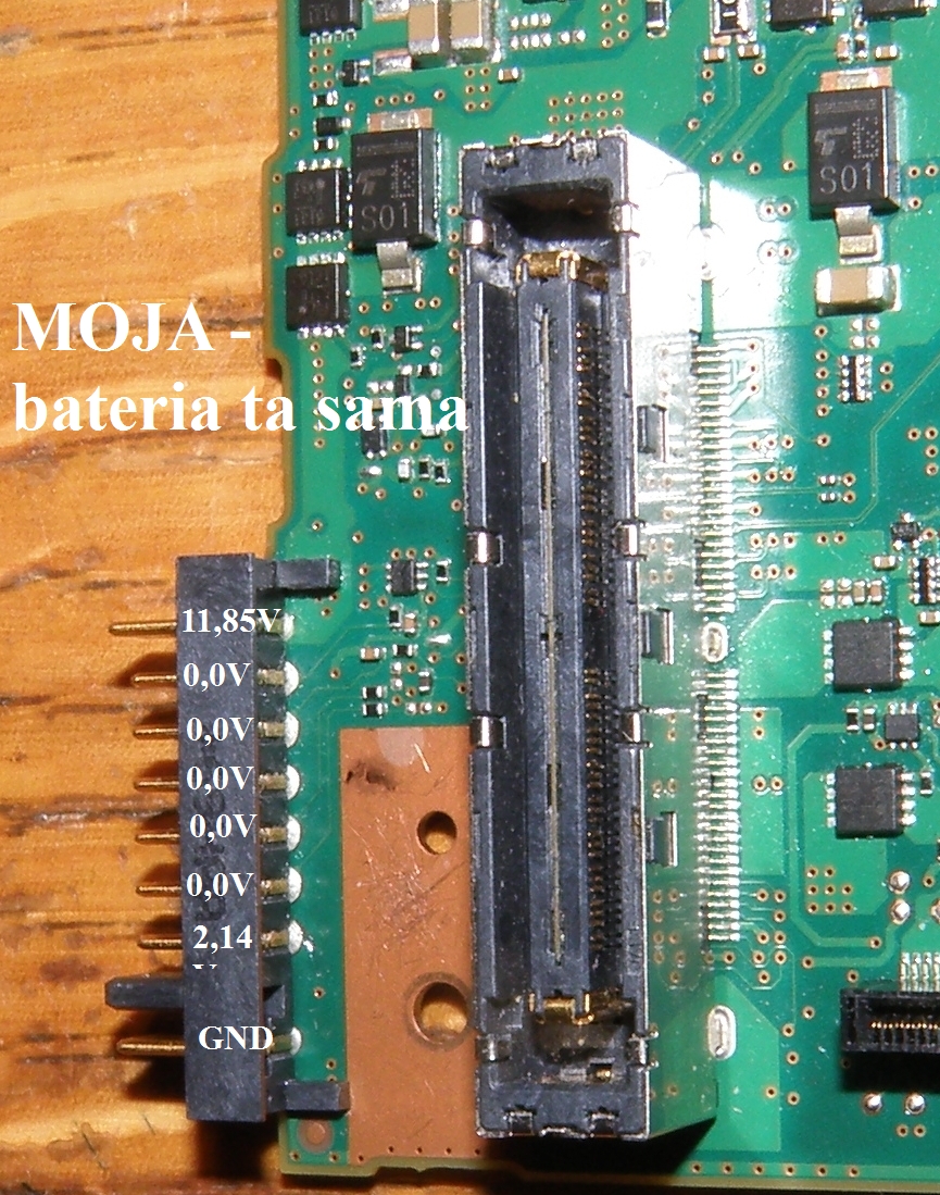 Teraz najważniejsze (dwa zdjęcia) - przy podłączeniu tej samej baterii na moją i testową są zupełnie inne napięcia na złączu baterii, a dokładnie jest ich na mojej właściwie brak, brakuje tego co wydaje się powodować, że bateria nie załącza laptopa - brak 3,3V.