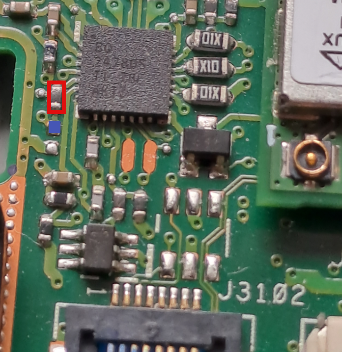 zmierz rezystancję pomiędzy wyprowadzeniami zaznaczonego na czerwono rezystora.