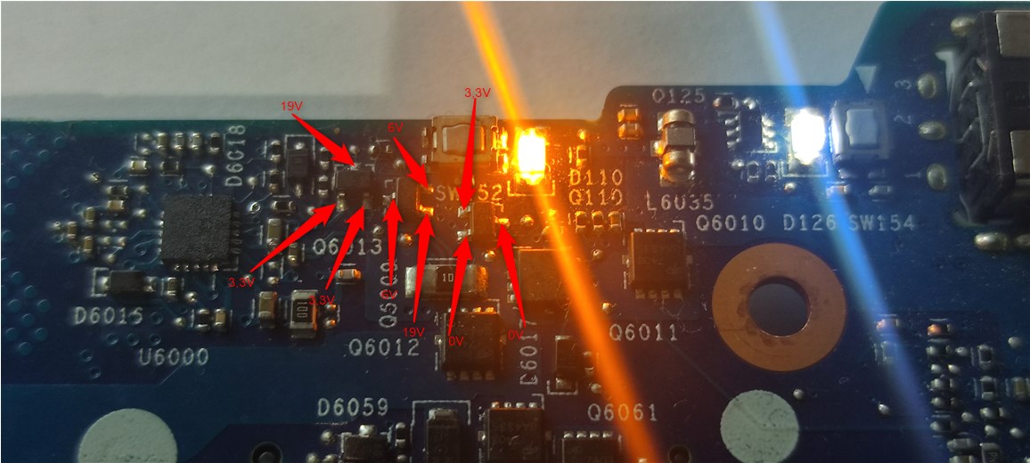 Dzięki za dotychczasową pomoc, nie mam boardwiev, więc nie wiem gdzie są dane tranzystory, ale podejrzewam, że to któreś z tych które pomierzyłem, dziwne jest to że diody dostają od razu zasilanie po wpięciu wtyczki zasilacza.