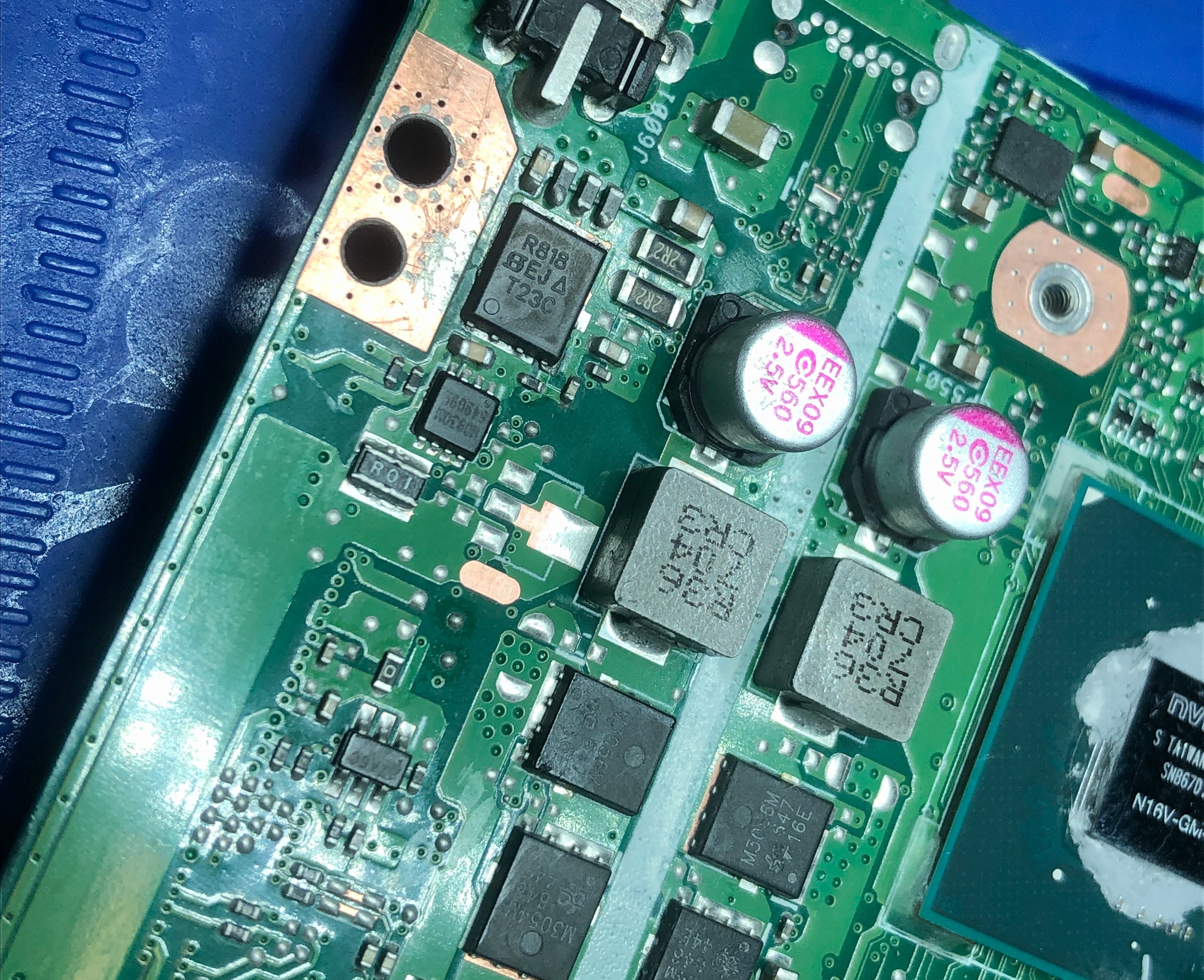 Laptop gdy trafił do mnie, nie włączał się i nie było reakcji na włącznik. Zero reakcji po podłączeniu zasilacza serwisowego. Przy oględzinach płyty głównej znalazłem miejsce w okolicach chargera po zalaniu czymś gęstym , jakiś sok. Miejsce dokładnie wyczyściłem, osuszyłem, znów wyczyściłem i wysuszyłem, wygrzałem na podgrzewaczu.