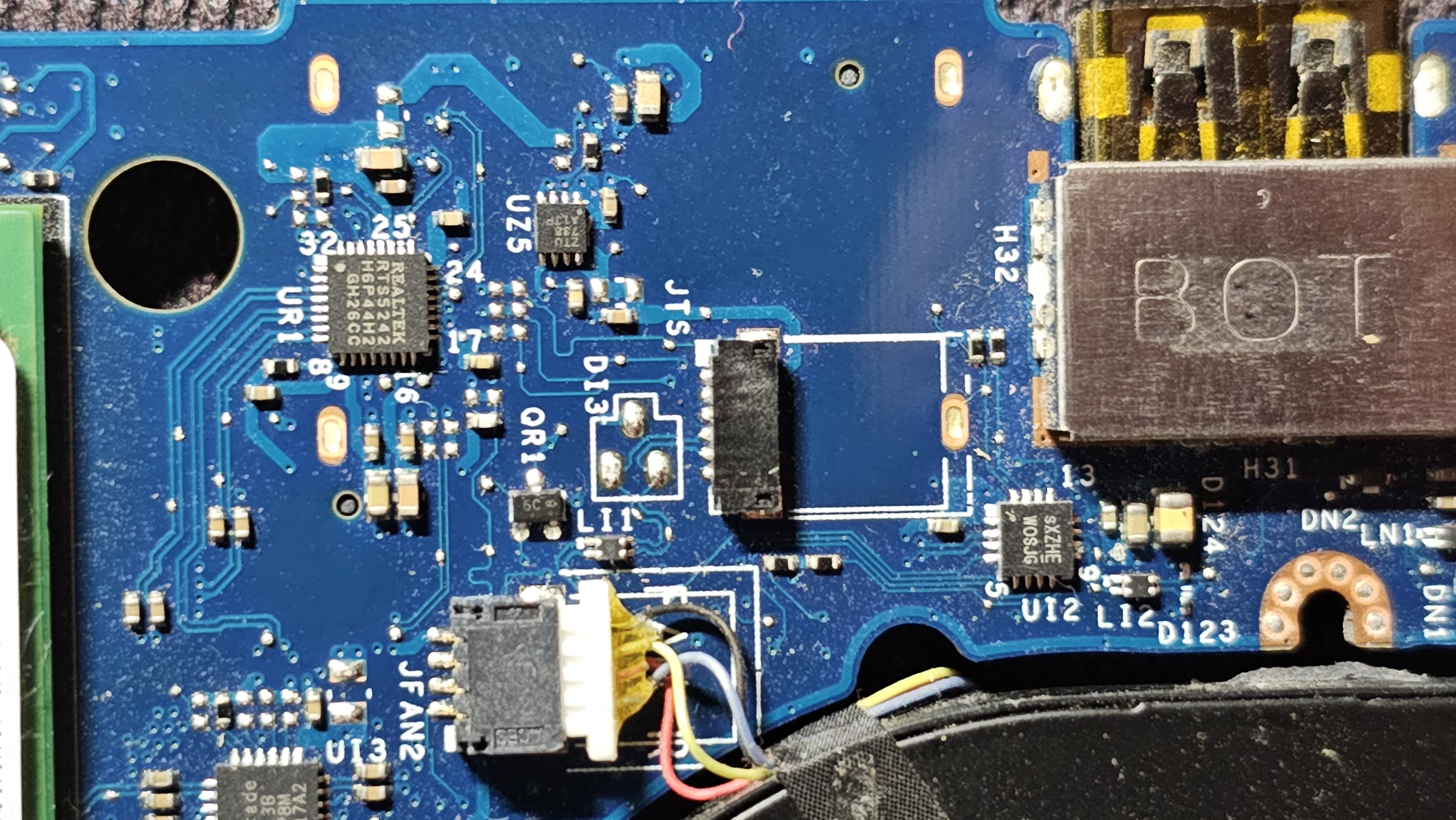 Sprawdź, czy podwójna cewka LI1 ma po obu stronach przejścia do gniazda JTS (piny 4 i 5), czy na pinie 1 złącza JTS masz stabilne 3V oraz, czy na pinie 2 tego samego złącza masz stan niski (0V). Dwa ostatnie pomiary wykonaj po włączeniu płyty, natomiast pierwszy pomiar z całkowicie odłączonym zasilaniem.