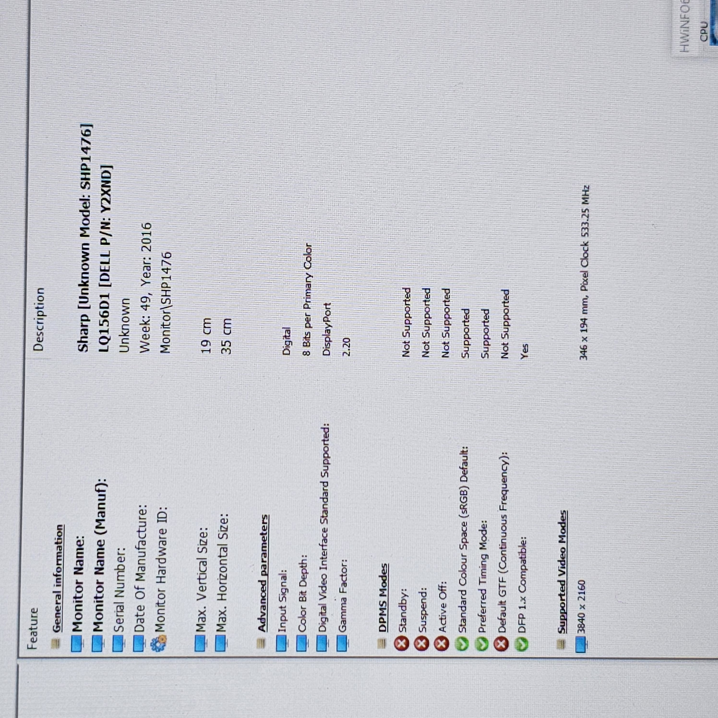 Uruchomiłem HWINFO i w dziale Monitor jest jak na zdjęciu. Model Sharp SHP1476