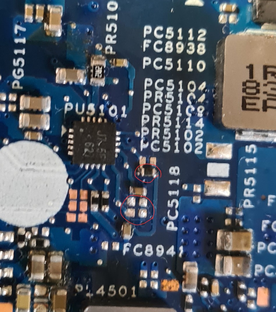 Laptop po zalaniu w okolicy PU5101, rezystory PR5104, PR5114, PR5102 były uszkodzone.