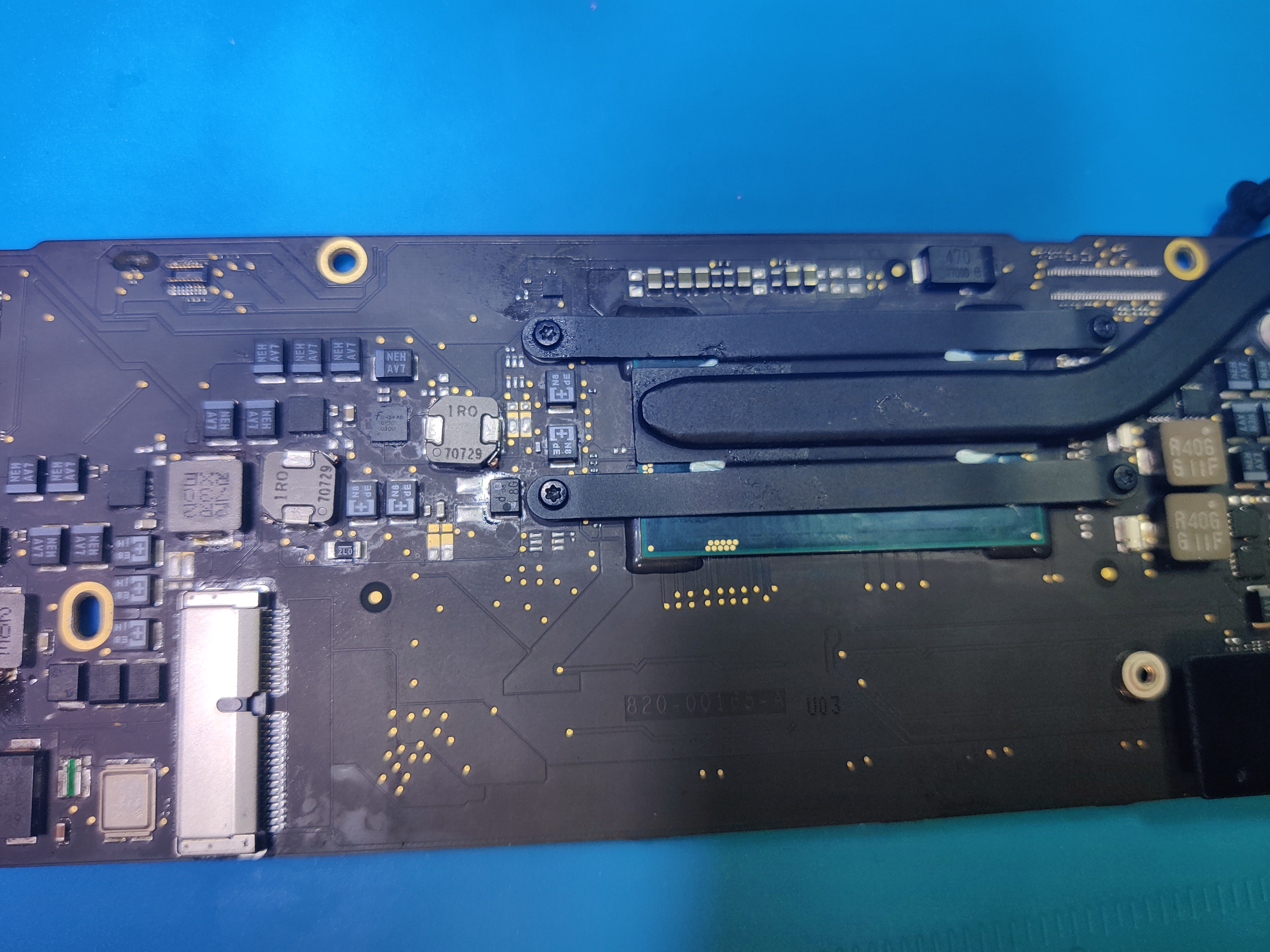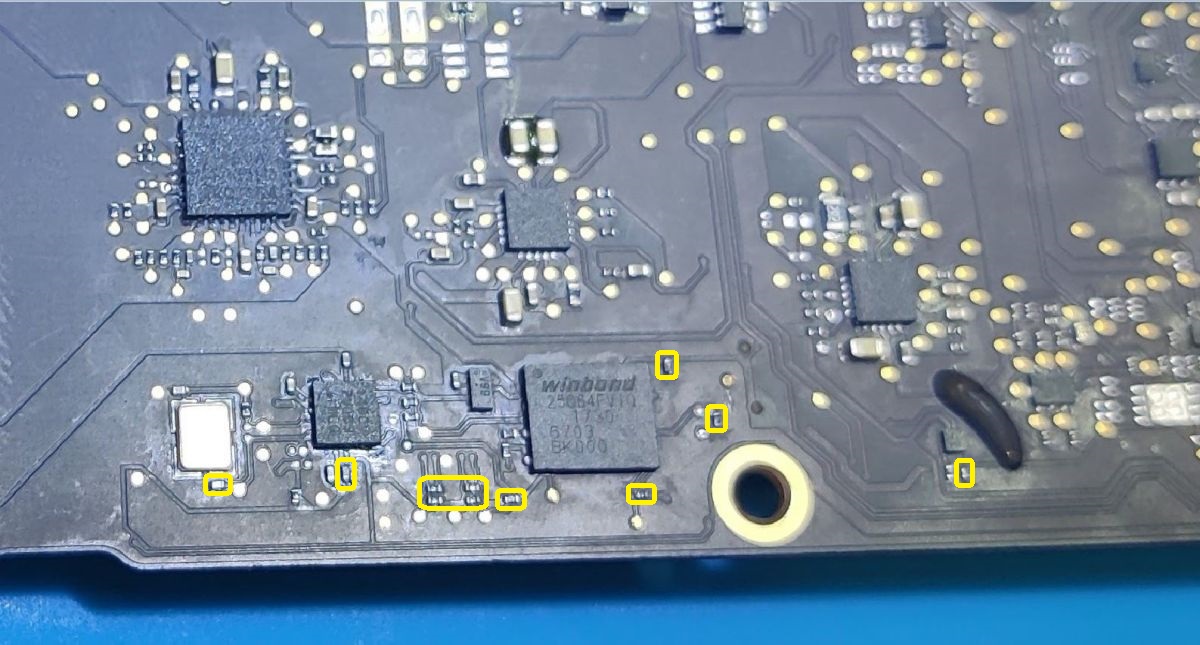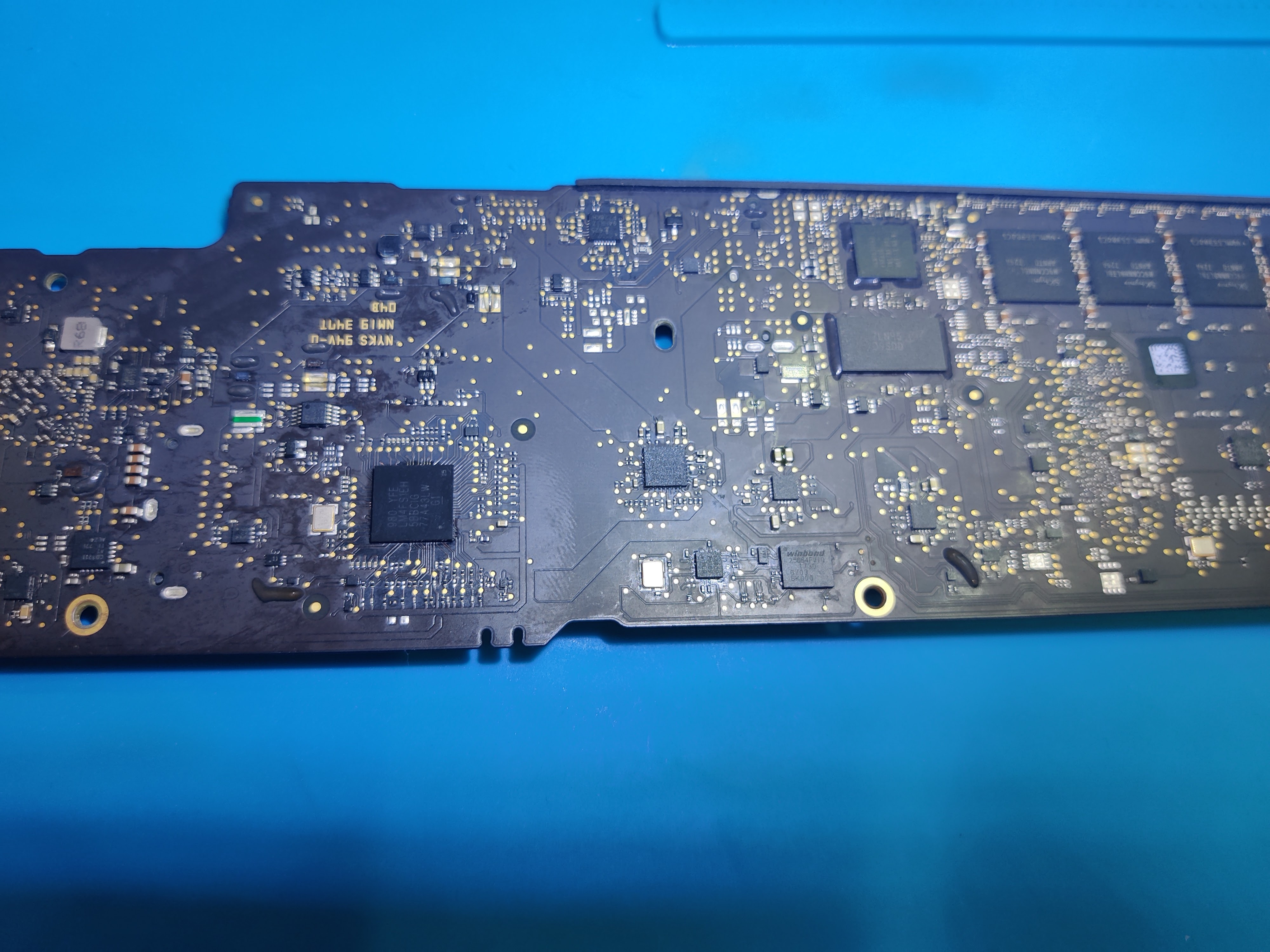 However, the pins of chips U1900, U7501 and EFI chip seems corroded. These chips must be removed from the board, the old tin must be removed with a desoldering wick and then the chips can be soldered back to its places.