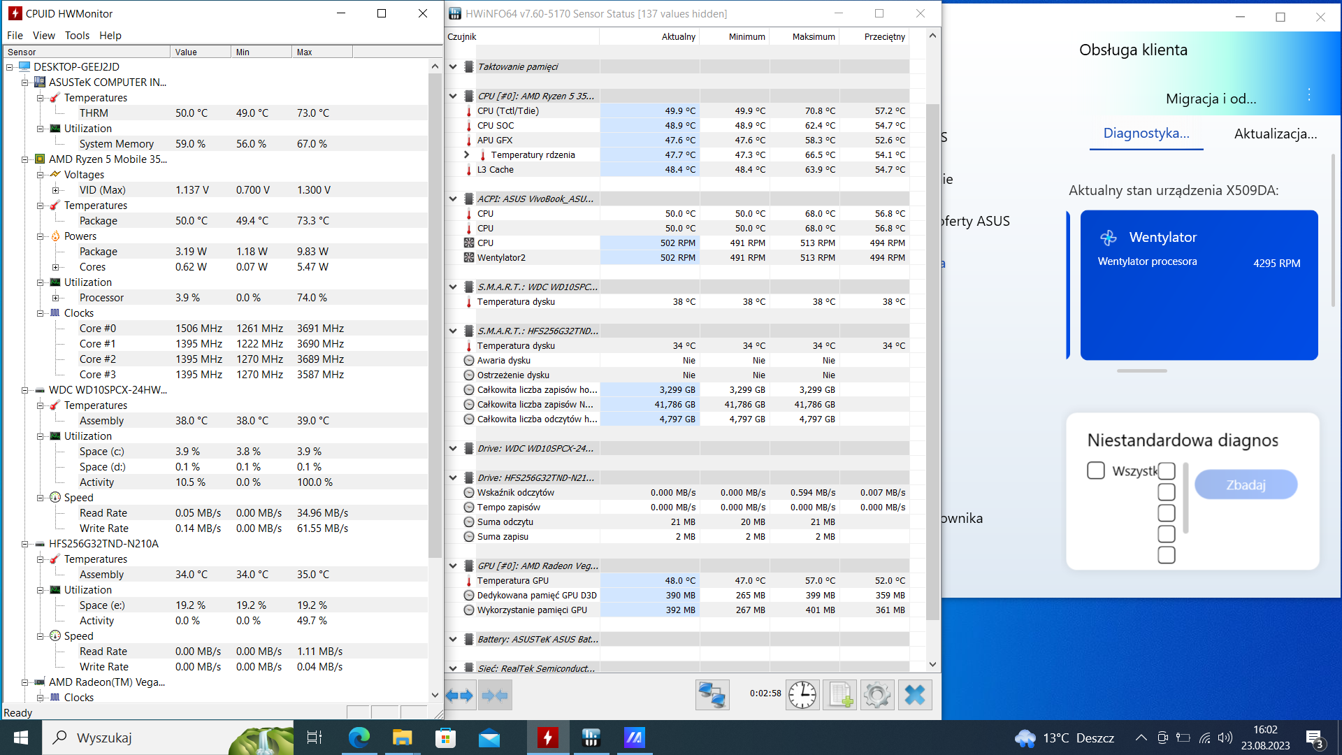 HWMonitor często wykonuje błędne pomiary i brakuje w nim odczytów, więc dołączam również HWInfo i aplikację MyASUS, która jako jedyna chyba odczytuje w miarę sensowne prędkości obrotowe wentylatora. Dodam, że na Windows 11 mimo instalacji wszelakich sterowników nie udało mi się uzyskać odczytu wentylatorów w HWInfo.