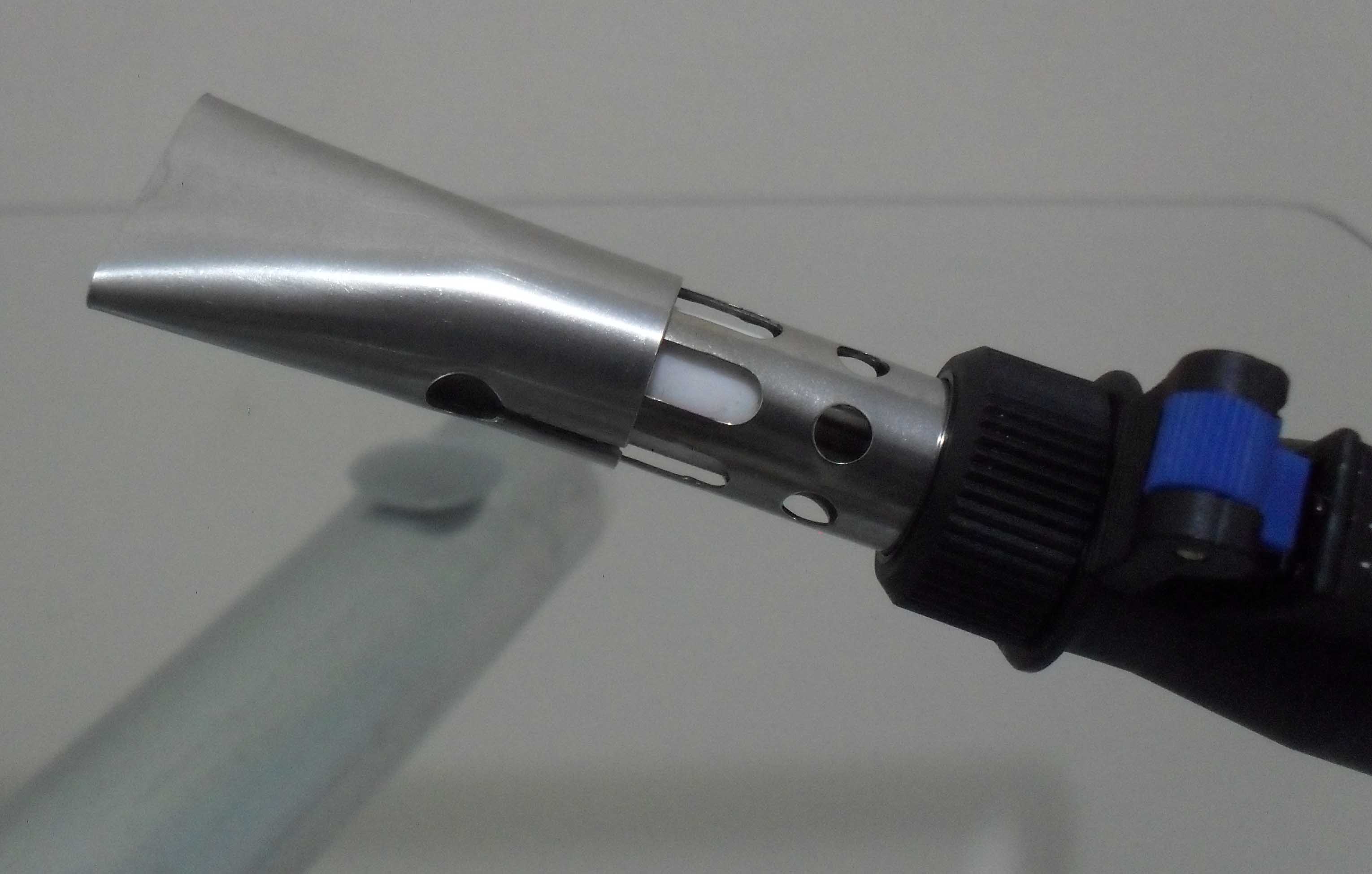 Without tips, it's like a mini-torch, goes up to 1200ºC (I forgot to take that picture, you can see it in the dark, showing the flame):