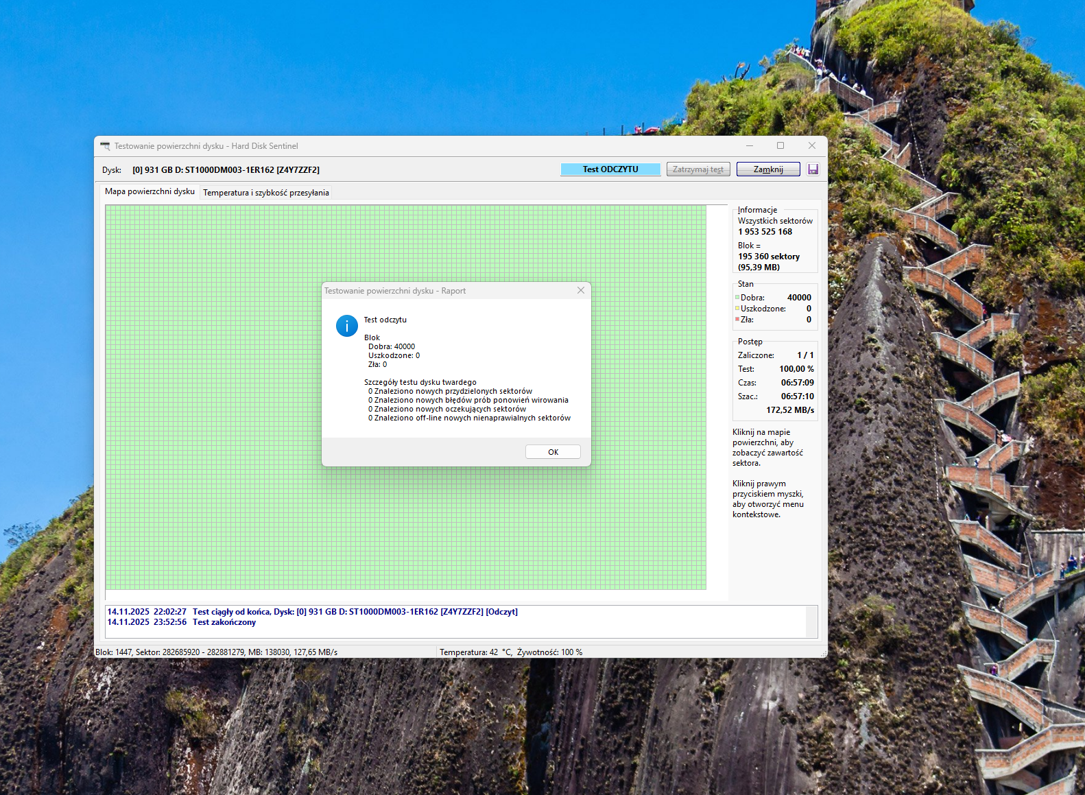 - i będzie miał jeszcze więcej, ale same godziny pracy nie mają dla stanu technicznego dysku żadnego znaczenia. Natomiast na pewno warto zrobić skan powierzchni, bo SMART jednak jest zbyt niedokładny, by opierać o niego diagnostykę i kategorycznie wypowiadać się o stanie dysku. SMART nie służy do zastąpienia pełnej diagnostyki, a jedynie ma ostrzec użytkownika przed zbliżającą się awarią w sytuacji, kiedy jego parametry zaczynają się pogarszać.