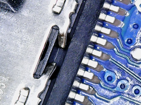 Niestety nie pomogę z uwagi na lokalizację, natomiast należy pamiętać, aby po połataniu ścieżek zabezpieczyć piny gniazda i odbudowane połączenia, pokrywając je soldermaską UV. Ponieważ gniazdo pracuje mechanicznie, niezabezpieczone połączenia po jakimś czasie się wykruszą - a soldermaska zapewni dużo większą trwałość takiej naprawy.