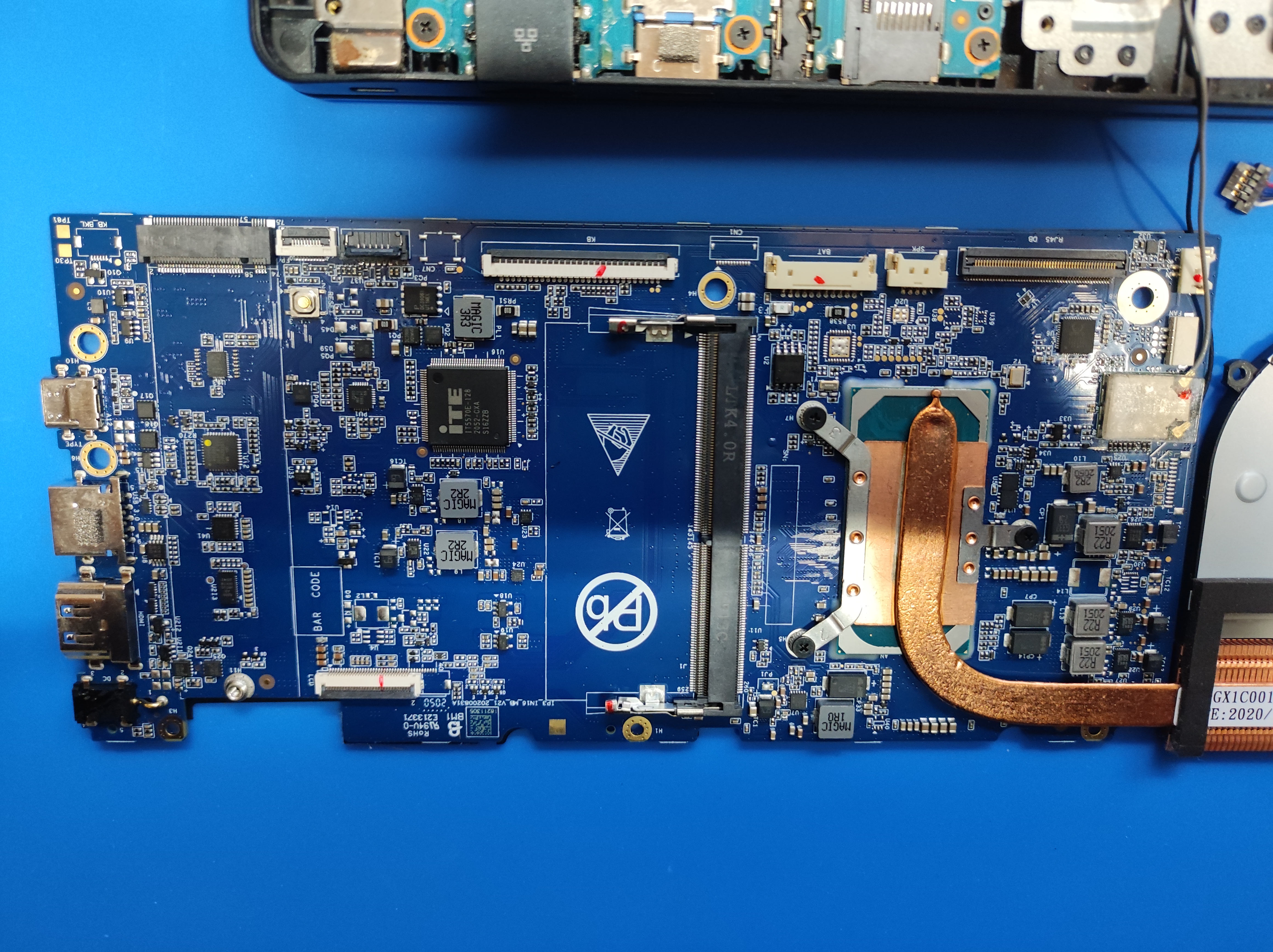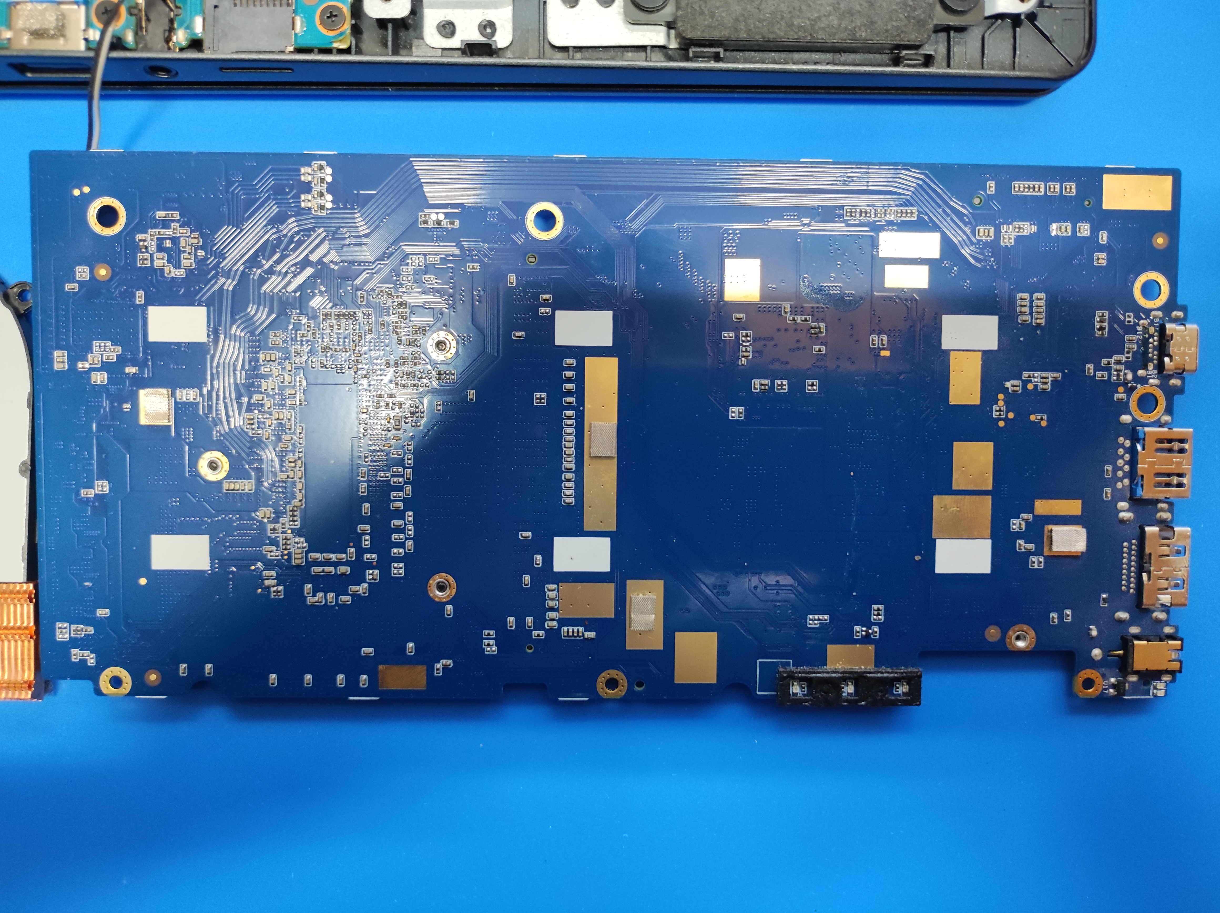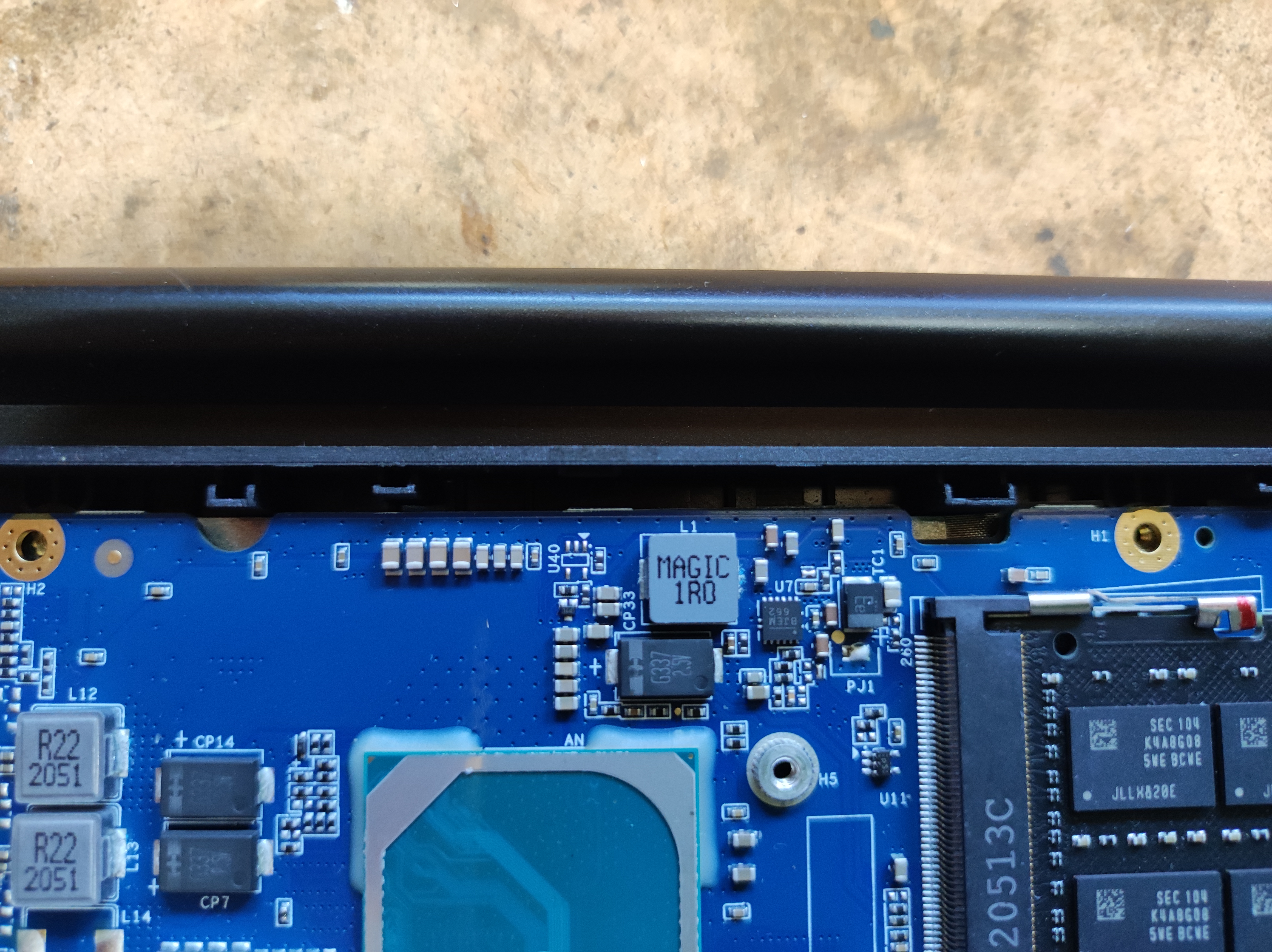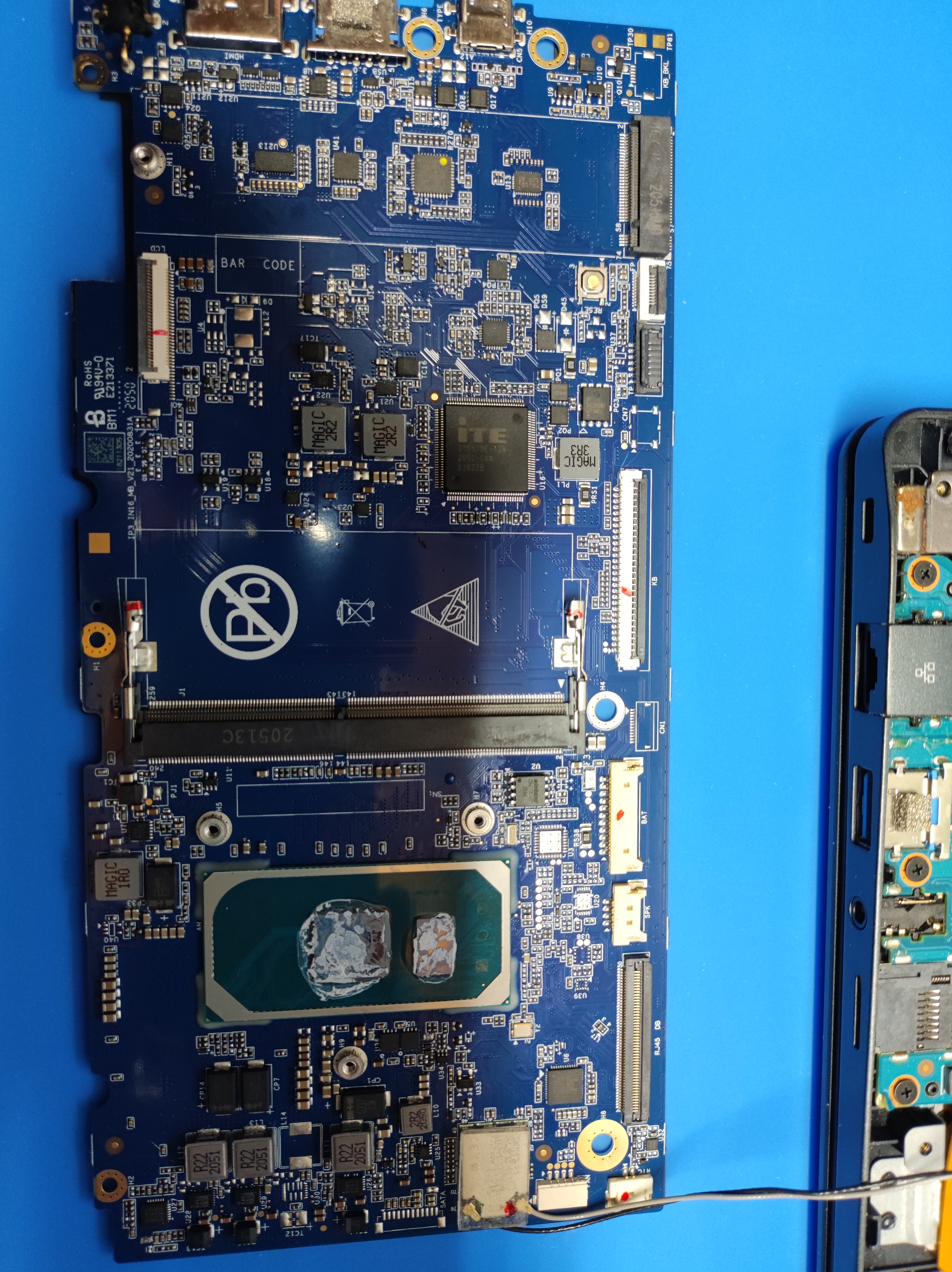 Nie mam schematu i nie wiem który pin idzie z włącznika w klawiaturze, ale jest na kilku pinach napięcie 3.3v i żadne nie zmienia się na 0v przy wciśkaniu klawisza power. Próbowałem przez rezystor zwierać te piny co mają 3.3v do masy ale brak reakcji. Wgrałem inny bios, nic to nie dało. Napięcie zasilania na kości bios jest obecne, obserwując oscyloskopem nóżki kości bios, na początku jest przez ułamek sekundy jakaś wymiana danych a potem już nic - stan wysoki. Rezystancja na cewkach bez napięcia L12,L13 dość wysoka - 47 oHm, co tutaj dalej począć?